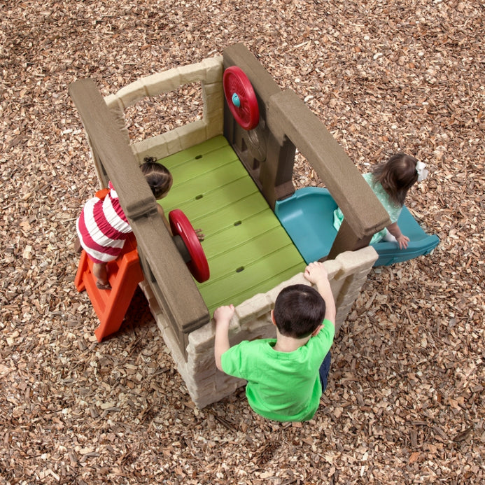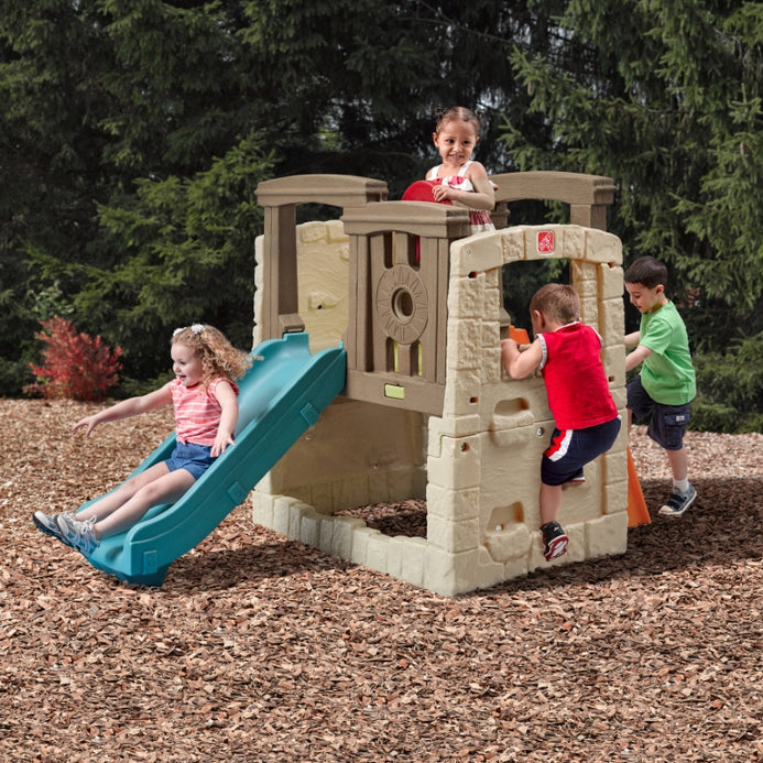 This kids’ outdoor activity set is ideal for climbing adventures for your little explorer! Complete with two climbing walls, slide, platform, and steering wheels, this Step2 climber challenges gross and fine motor skills. The more kids play climbing and sliding, the more physical activity they’ll get! The best part? This durable climber set will outlast the toddler years and many hours of play. Plus, the natural colors and realistic textures blend beautifully into any backyard play space. Made in USA of US and imported parts.