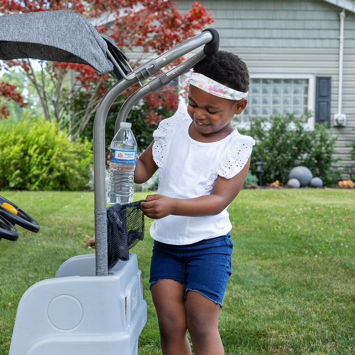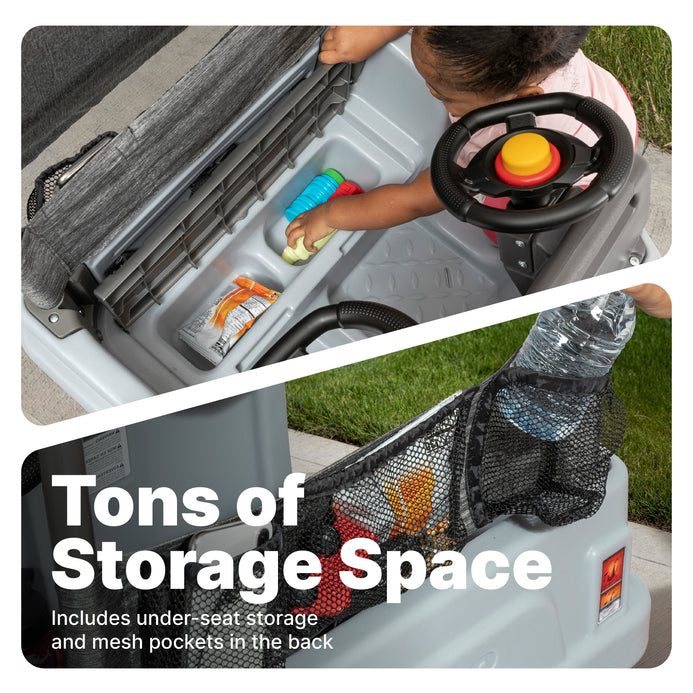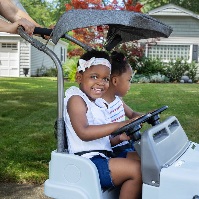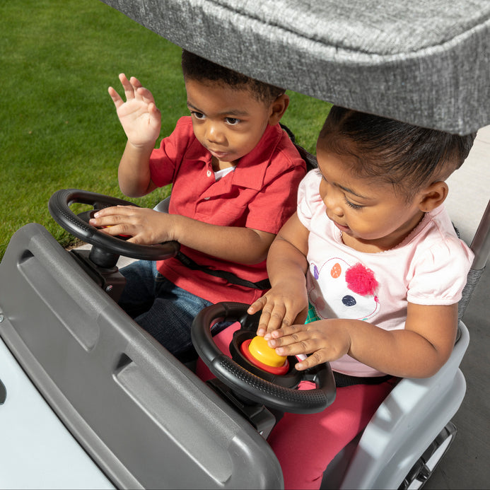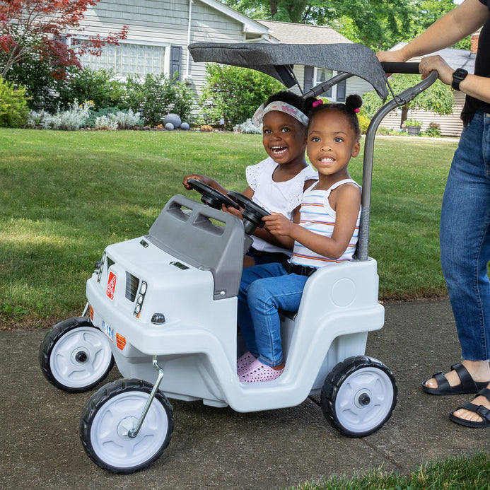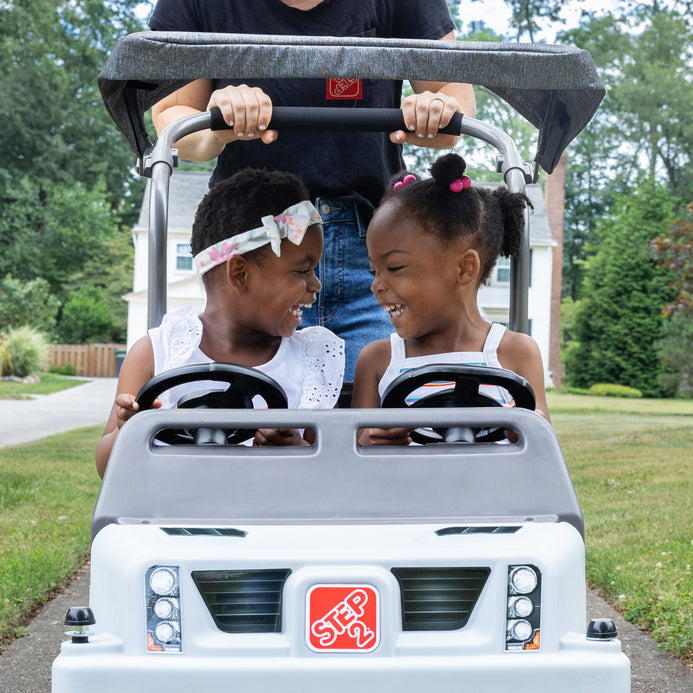 Take the fun of outdoor ride-on toys to the next level with the side-by-side design of this double ride-on! Two toddlers can ride comfortably in the all-new Side-By-Side Push Around SUV™ by Step2 each with contoured seats and lots of leg room. From the realistic off-road SUV styling to the large wheels with swivel steering and extra storage under the seat bench this double ride-on toy has so many features that add excitement to any adventure. Buckle up with the two seat belts and fold the adjustable canopy down to lock into place for a shaded ride. Little ones can even pretend to drive their off-road dune buggy each with their own steering wheel! There’s even extra storage for parents too; store trip essentials in the mesh pockets on the back of the canopy base. No wonder the step 2 push car is one of our customers' favorites! Ready to ride? With this double-sided ride-on walks around the neighborhood and beyond are a breeze! Made in USA.