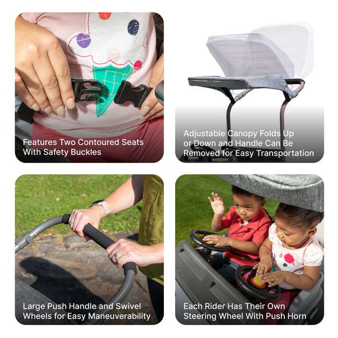 What's Included: Double-sided ride-on base, 4 wheels, canopy, 2 safety belts, 2 steering wheels, decals, and assembly hardware