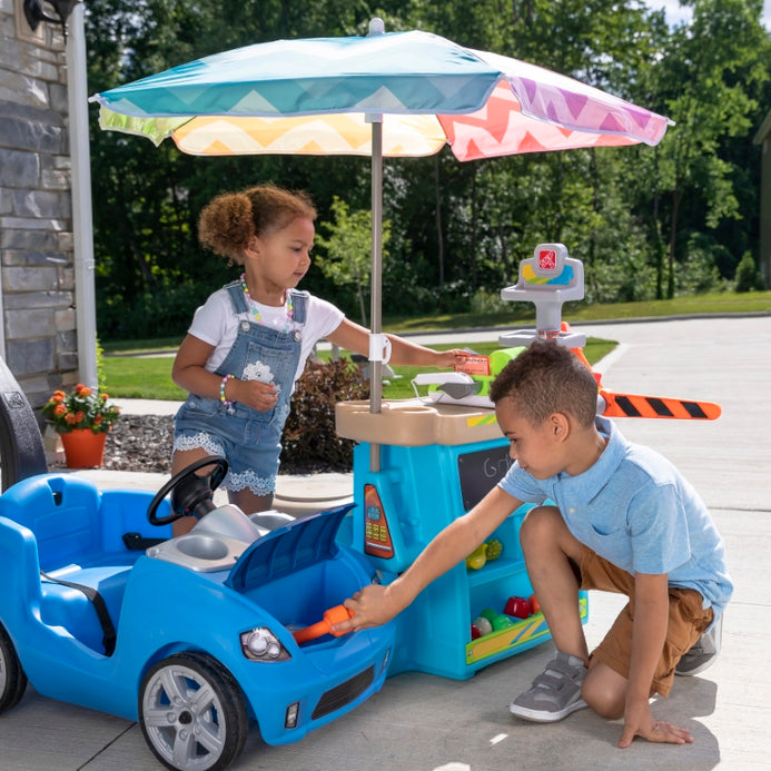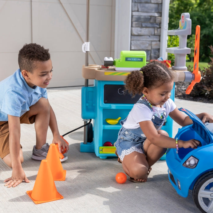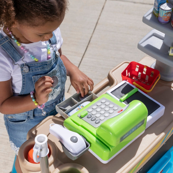 Little entrepreneurs, get your stands ready; we predict lots of fun and learning! The Step2 Stop & Go Market™ has it all! This pretend market comes with a gas pump, tollbooth, cones, chalkboard, and working cashier. Kids can take turns role playing as the cashier and customer. Little ones can pull up to the market on their bikes or play cars to fill up on gas and pay the toll. They can even use the chalkboard to write out daily specials, gas prices, or the name of their market. This play market has an umbrella to keep kids protected and cool from the sun, and it also has wheels, so they can easily move it around to their next location!