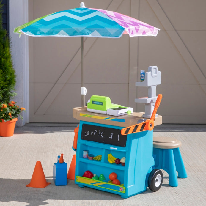 - In the box: Mobile market base with wheels, 40” umbrella, stool, 2 traffic cones and toll arm, chalkboard, and electronic cash register.