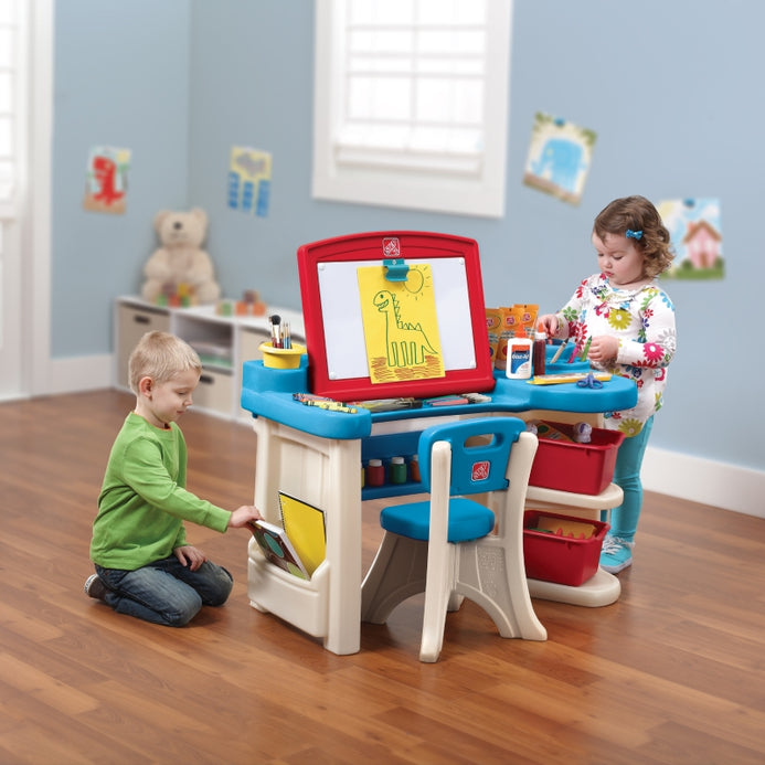 With this Step2 Art Desk, little ones can draw or paint right side up with the easel or lower the surface board to the desk to design more artistic creations. This kids 2-in-1 creative play studio will enhance fine motor skills as mini artists draw and paint on both art surfaces. Made in USA of US and imported parts.