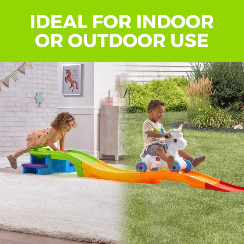 Coast into the magical world of unicorns on the Step2 Unicorn Up & Down Roller Coaster™! Full of fun and whimsy, this unicorn-themed coaster is ready for kids to ride into fantasy land aboard an adorable unicorn car. Lock the steps into the platform, where the unicorn awaits the journey through 9 feet of rainbow riding track. Two easy-grip handles, foot rests, and a high back ensure a secure ride on the unicorn car. A motion activated light and sounds add to the magic as little ones ride!