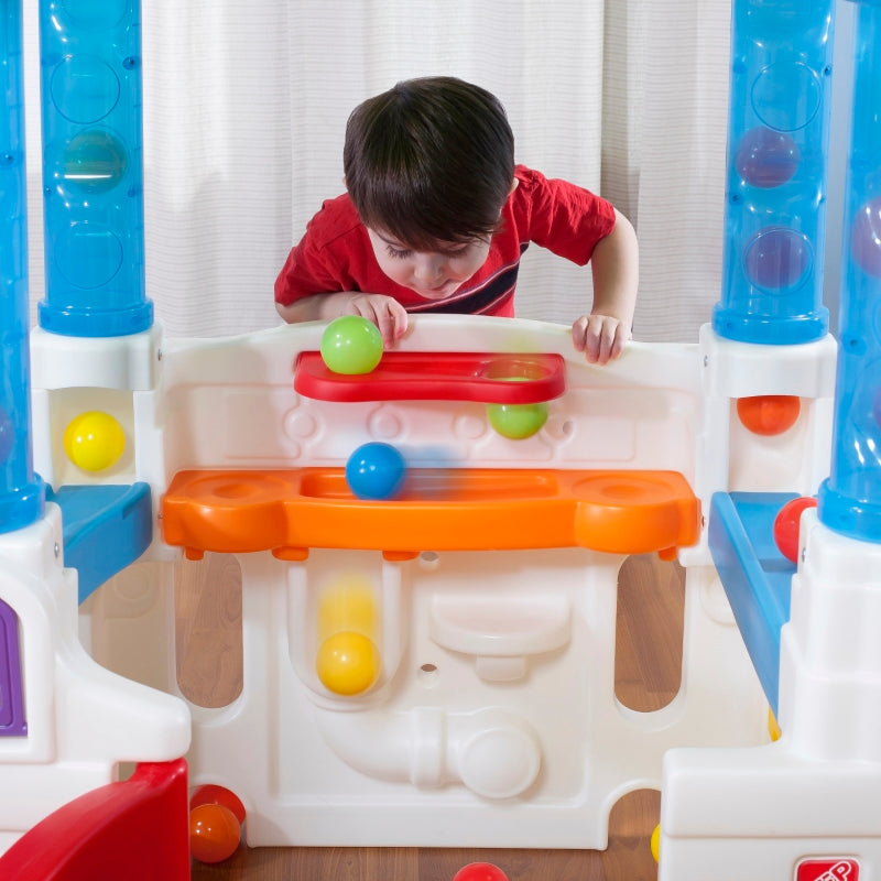 All around ball play starts when little ones come home to their WonderBall Fun House™! This indoor or outdoor playhouse includes so many ways to play, from the rooftop tubes to indoor maze and side flipper station. Toss the play balls onto the roof and watch as they fall through the tubes, activating a fun plinking sound as they go! On the inside, place play balls on the ramps and watch them zig-zag through the maze to the bottom basin. Features like the Dutch-style door, open concept design, and pass-through mailbox complete the toddler playhouse’s curb appeal and provide hours of put-and-take style play. Made in USA.