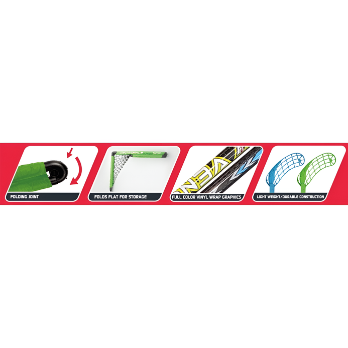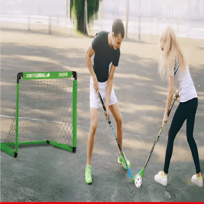 - COMPLETE SET: Includes one foldable goal net, two 90 cm hockey sticks, and a 2.5 cm floorball for immediate play