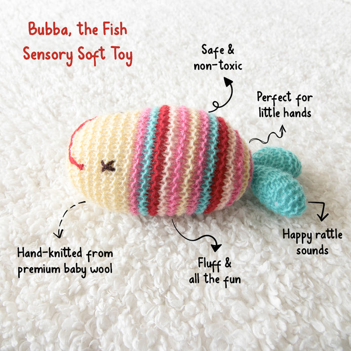 • SIZE & MAKE- One adorable soft toy, hand-knitted from premium baby wool, Integrated rattle sounds. 19 cm length (approx.) Handmade with care in India.