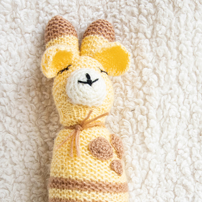 • SIZE & MAKE- One adorable soft toy, hand-knitted from premium baby wool, Integrated rattle sounds. 19 cm length (approx.) Handmade with care in India.