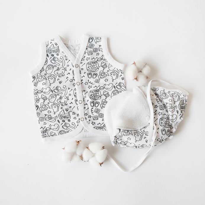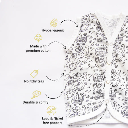 Yellow Doodle Baby Vest (Jhabla) & Nappy (Langot) are ethically made using the finest organic cotton and are printed with chemical free dyes, a safer choice for our environment and for your baby. At Yellow Doodle, we care about how your baby feels in anything they wear, hence we only choose soft and breathable fabrics. Each piece is not only made with premium cotton, but also features flat seam stitching so that there’s no irritating inner seams, non-toxic printed labels means there’s no itchy tags, double stitching ensures durability and comfy enough as your baby grows. Popper fastenings have been used for easy dressing and quick changing and above all, they are lead & nickel free to prevent skin irritation. We really do care about the little things. Our nappy features a special super- soft microfleece lining that sits right next to your baby’s skin, it draws away moisture for that stay-dry feel, so baby won’t sense a thing (upto one pee*). They also have soft elastic bands, that are gentle and comfortable on little tummies. A diaper-free time essential, you’re thus proudly able to reduce the amount of waste sent to landfill sites. (* varies with the wetting pattern of the baby).