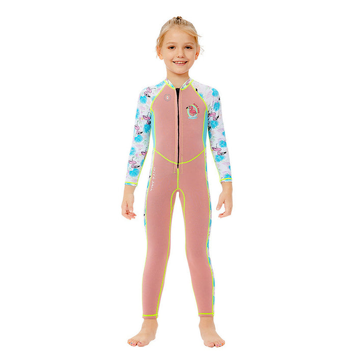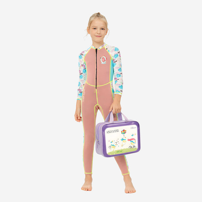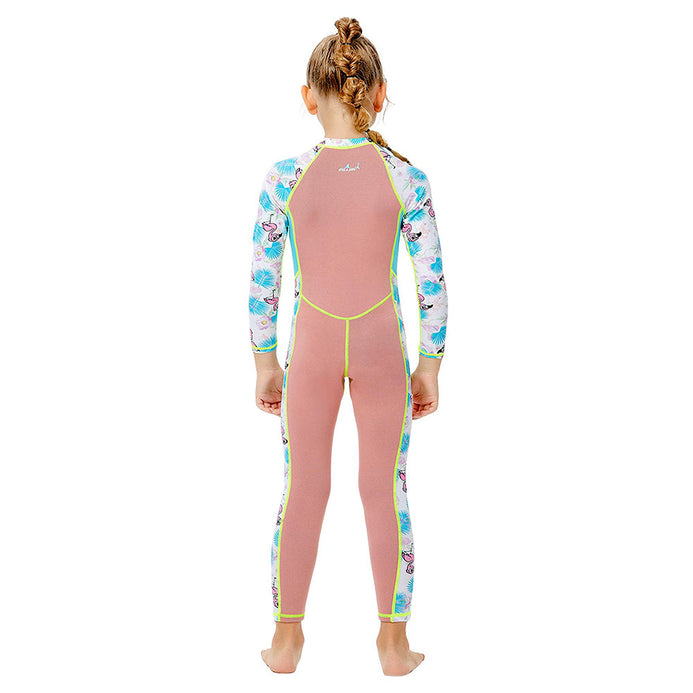 2. Specialised Swimsuit Design: This swimsuit comes in a soft peach base with contrast aqua side panels and neon green stitch detailing. This Swimsuit is perfect for water sports activities like Scuba Dives and Fun Water Sport adventure. The chest is highlighted with a cute flamingo patch. The full sleeves feature flamingo and tropical leaf prints in pastels, enhancing its tropical look.