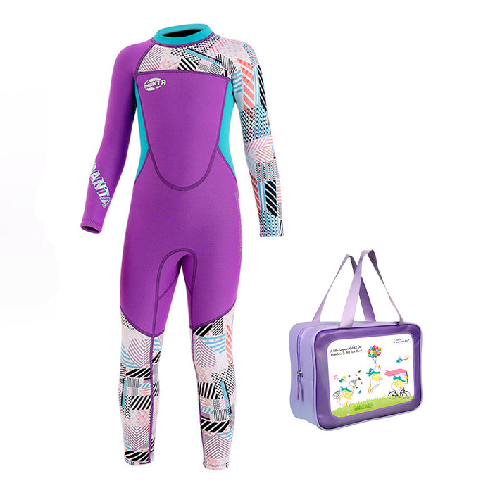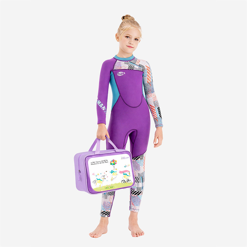1. High Quality Material: This kids’ wetsuit is made of 2.5mm neoprene with nylon elastic fabric, providing excellent insulation and protection against cold water. The premium thickness helps retain body warmth, reduces water resistance, and ensures comfort during swimming and underwater activities. 2.Specialised Swimsuit Design: This swimsuit comes in a vibrant purple color with contrast teal side panels.This Swimsuit is perfect for water sports activities like Scuba Dives and Fun Water Sport adventure. It is a full-length swimsuit featuring stylish geometric printed sleeves and lower legs in multicolor patterns. The bold color combination gives it a sporty, modern, and energetic look suitable for young swimmers.