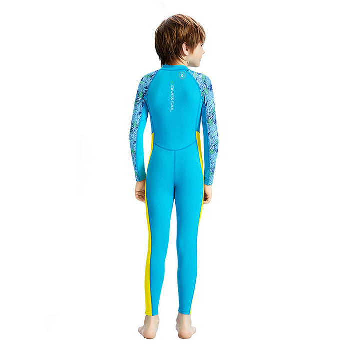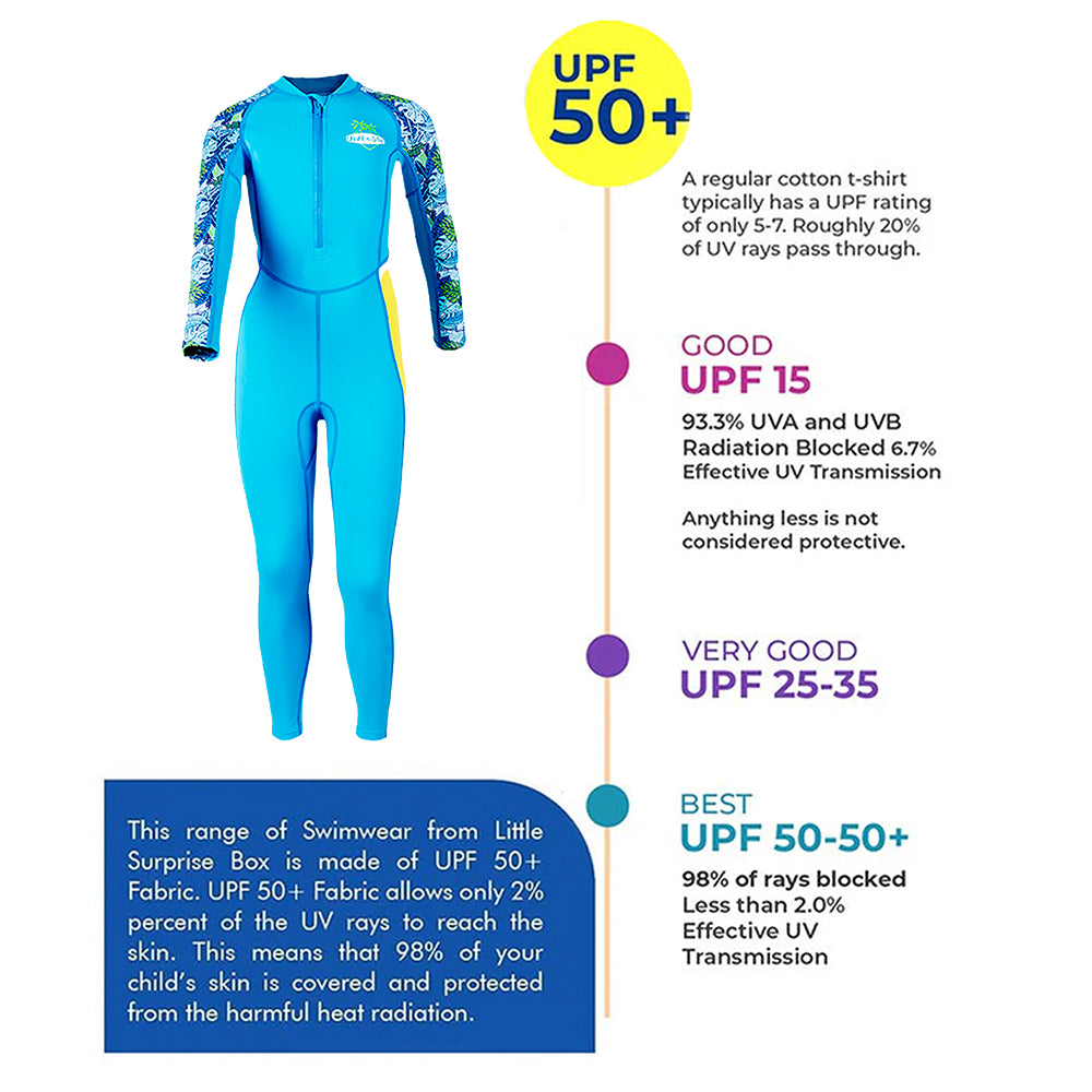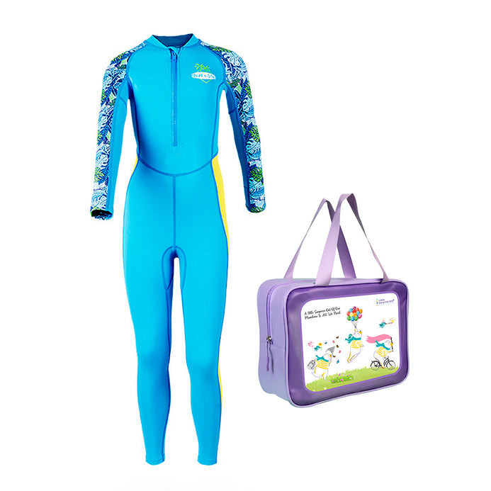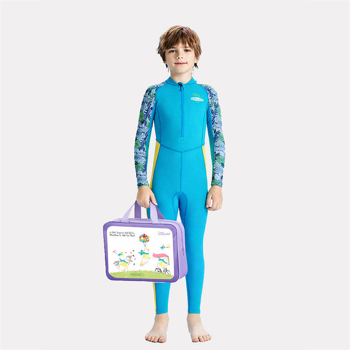 Full Length Dive Blue Leaf Printed Kids Swimwear in UPF 50+ Fabric with Swim Cap & Free Washbag