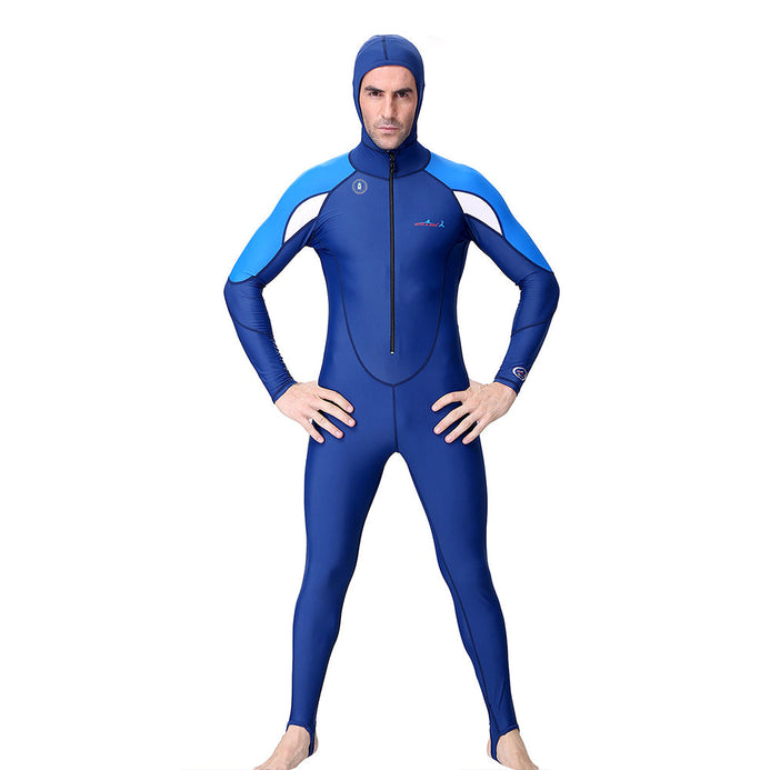 Full-Length Navy Blue Hood & Stirrup Foot Loop, Teens and Mens Swimwear in UPF 50+ with Free Washbag