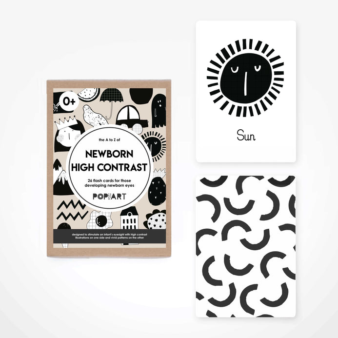 "- This box contains 26 double sided cards featuring black and white everyday objects starting with each letter of the alphabet. Each card has a whimsical illustration with the name of the object on one side, and a bold high contrast pattern on the other.
