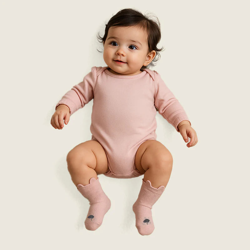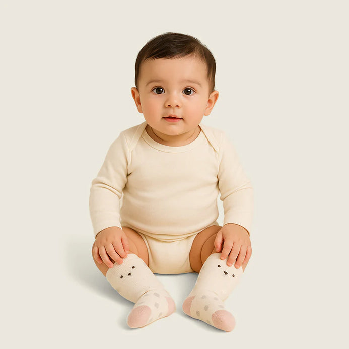 This Cuddle Socks Bundle comes as a set of three socks– a cream bear with soft polka dots, a pastel grey pair with subtle paw prints, and a blush pink pair with a playful design. Neutral yet adorable, these socks pair beautifully with any baby outfit and make a thoughtful gift for newborns.