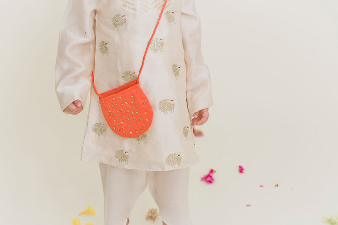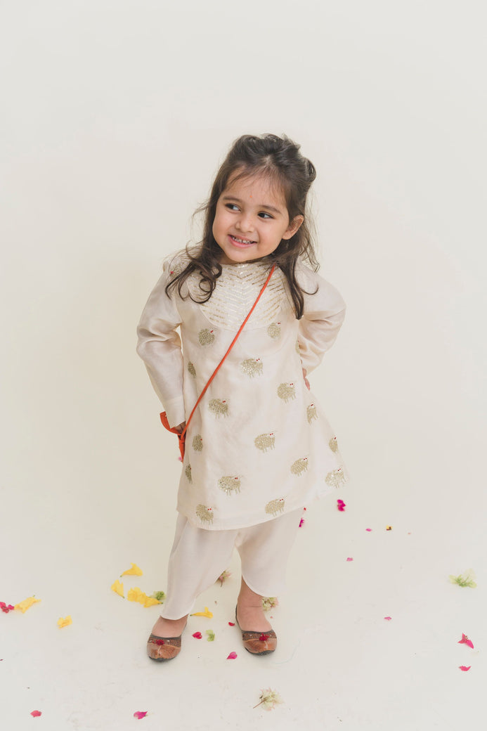 Hand Embroidered Off White Chanderi Sheep Kurta With Muslin Dhoti