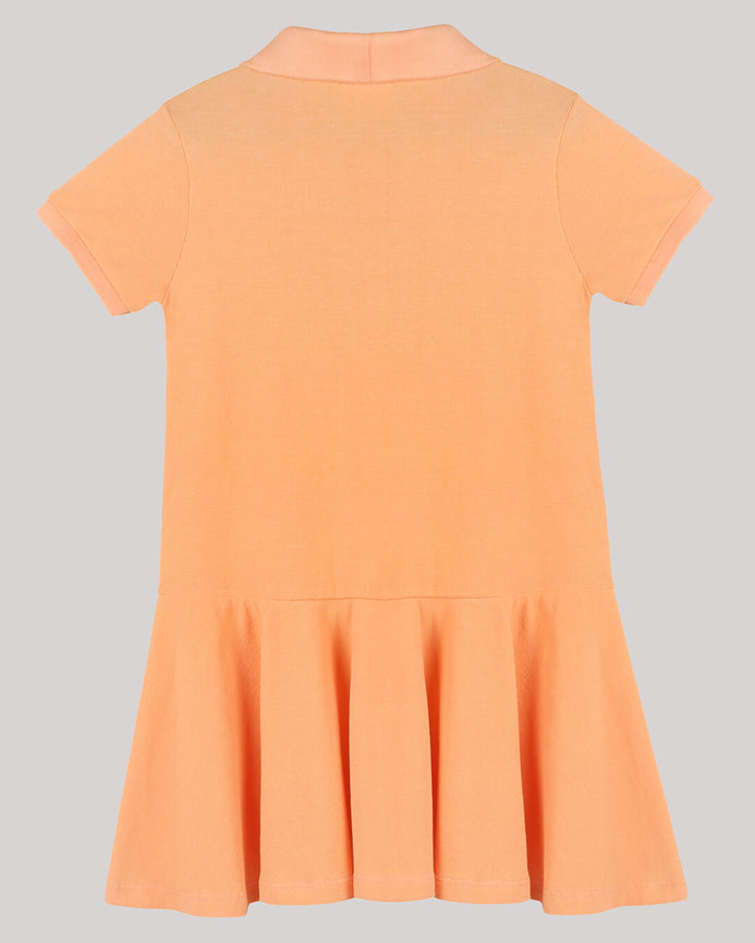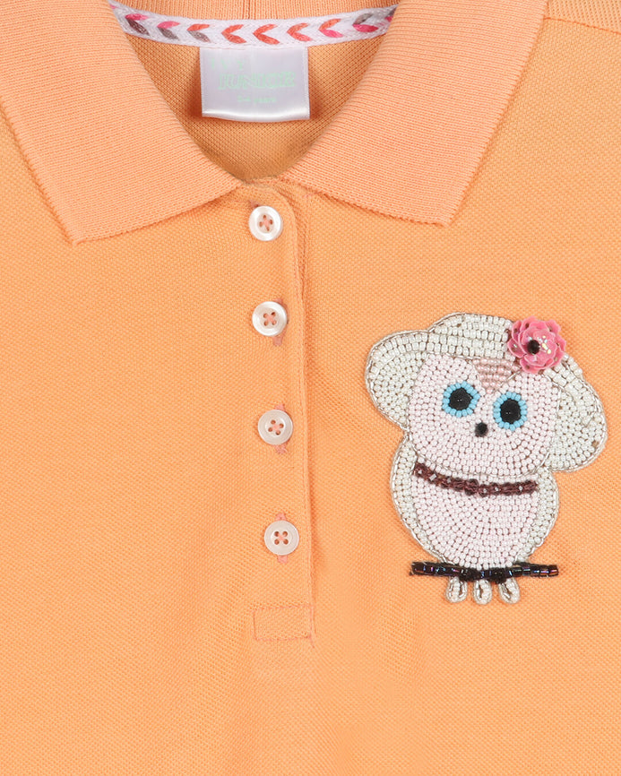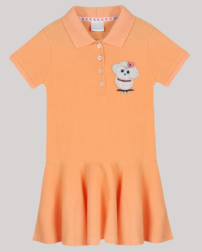 Peach Polo Dress With Drop Waist Silhouette And Hand-Embellished Owl Motif