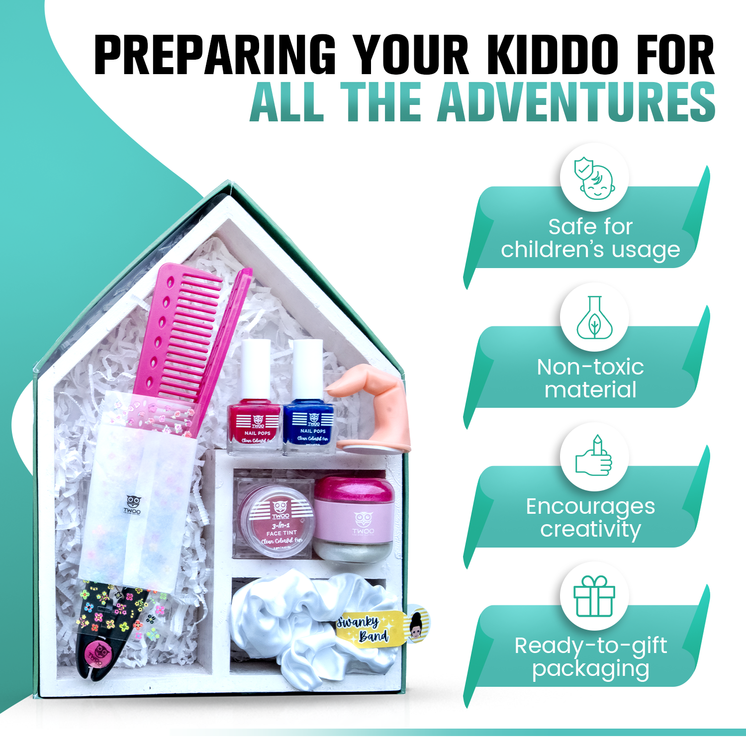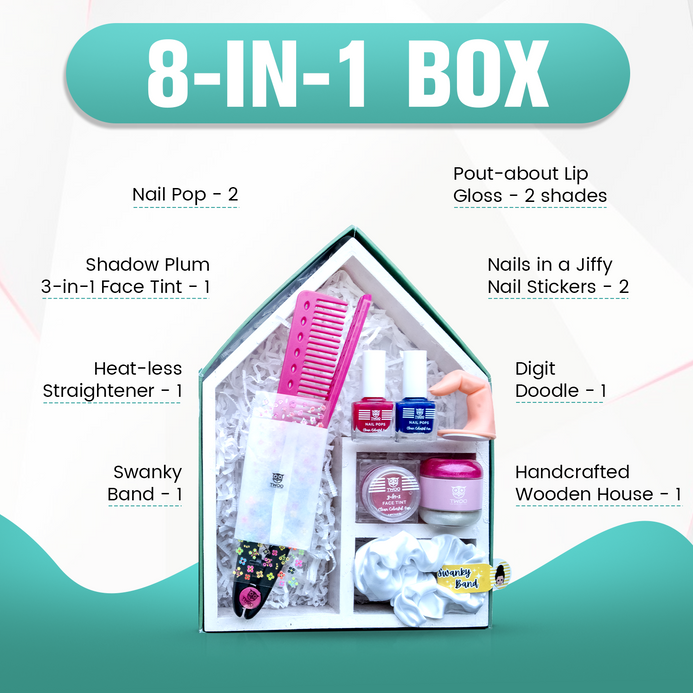 Get your fearless child shine with our dauntless wise box! Start by applying the 3-in-1 face tint for that blood-rush look. Let them choose their favorite nail pop color and give their nails a vibrant touch. Swipe on some pout-about lip gloss for a shiny smile. Use the heatless straightener to tame their hair and add nail stickers for extra flair in a jiffy. Finish off with the swanky band for a stylish look. Is your child ready to conquer? Go ahead, let them get creative, and unleash their bravery!