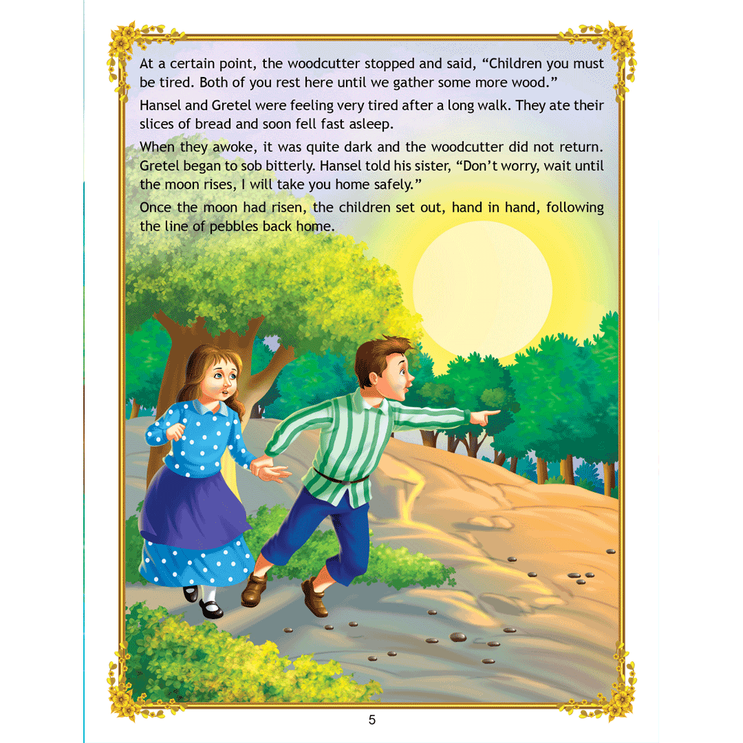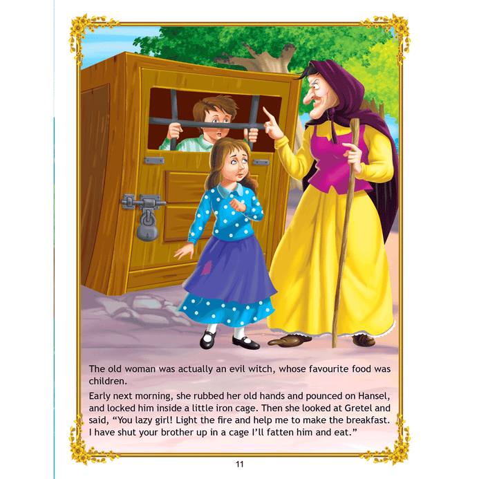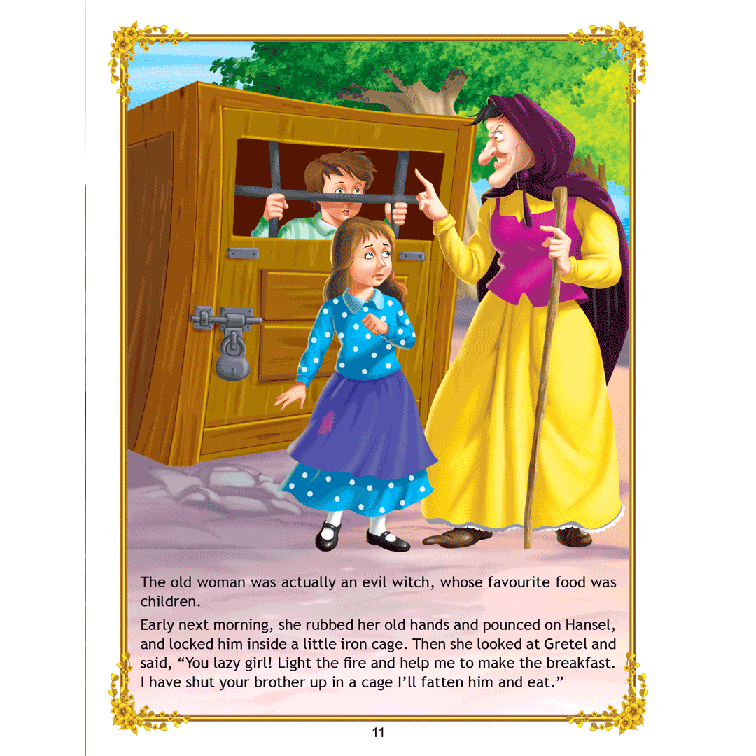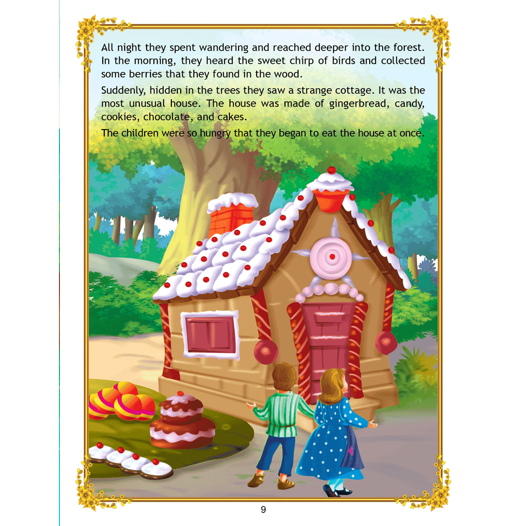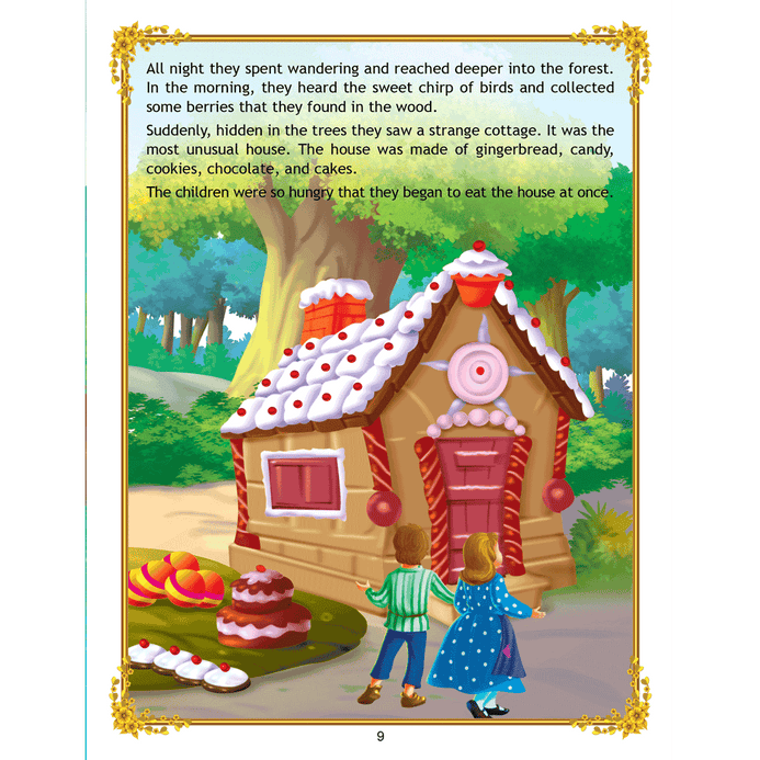 ‘Hansel and Gretel’ is a story of a brave brother and sister who love and care for each other. Left alone in a forest, they fall into the hands of a witch who lives in a house made of gingerbread, cake, and candies. Both kids not only with their wit cleverly free themselves but also return home rich and live happily ever after. Adorned with charming illustrations, retold in easy language, this is a beautiful book to treasure. • 16 pages • Ideal for age-group 2-6 years • Amazing illustrations • Colourful cover • Inculcates reading habit This storybook is sure to encourage a lifetime love of reading. Filled with humour and adventure it will enchant young readers and listeners. Easy-to-understand text ensures that kids enjoy reading it and improve their language skills as well.