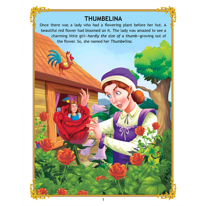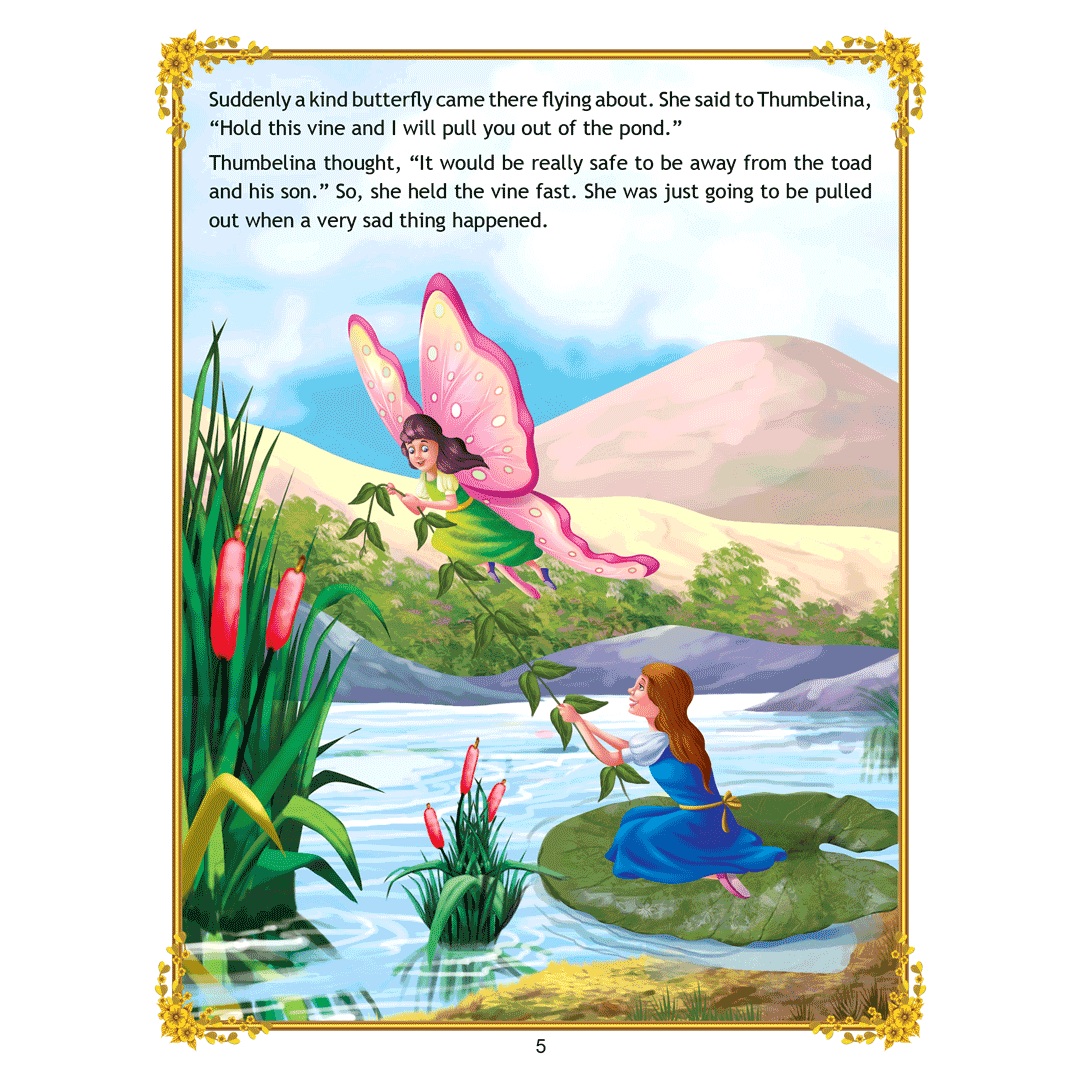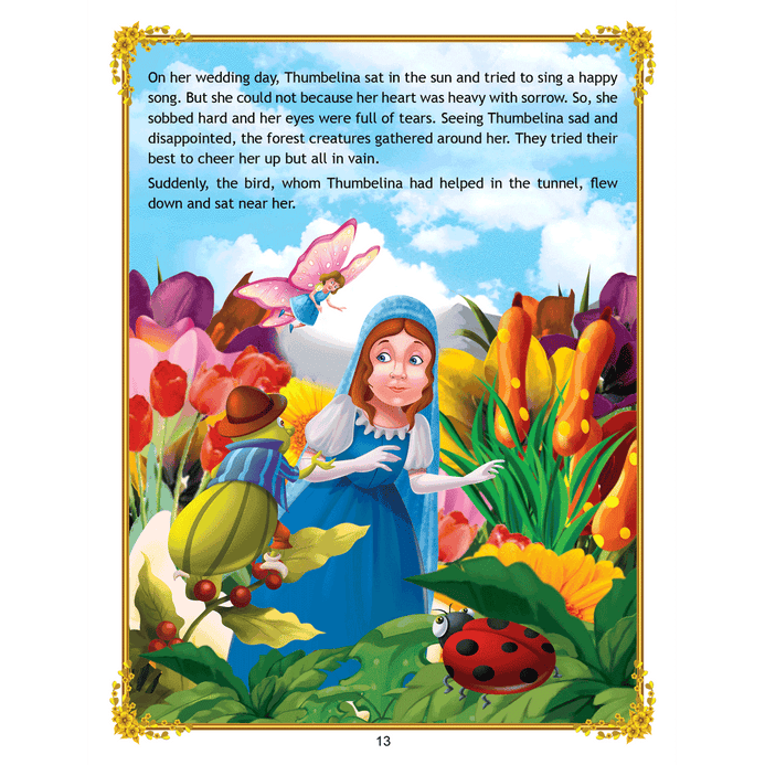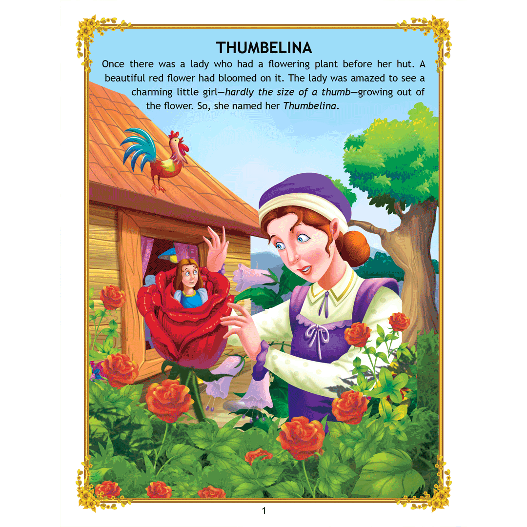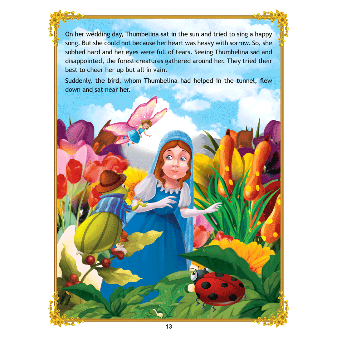 ‘Thumbelina’ is a story of a cute tiny thumb-sized girl and her adventures with toads and moles until she meets a flower-fairy prince just her size. Adorned with charming illustrations, retold in easy language, this is a beautiful book to treasure. • 16 pages • Ideal for age-group 2-6 years • Amazing illustrations • Colourful cover • Inculcates reading habit This classic retold tale is sure to become a favourite of all readers. Filled with humour and adventure it will enchant young readers and listeners. Easy-to-understand text ensures that kids enjoy reading it and improve their language skills as well.