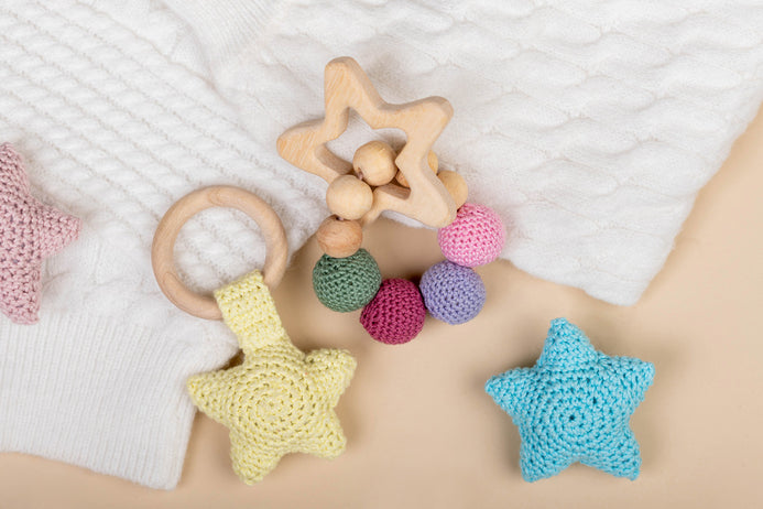 WOODEN RATTLE AND TEETHER WITH CROCHET BEADS IS A CAPTIVATING TOY DESIGNED SPECIFICALLY TO STIMULATE YOUR CHILD AND ENSURE TO CAPTURE AND SLOWLY HELP THEM FOCUS THEIR ATTENTION TOWARDS THE SOUND. CRAFTED WITH UTMOST CARE AND ATTENTION TO DETAILS, THIS DELIGHTFUL TEETHER AND RATTLE OFFERS A PERFECT COMBINATION OF FUNCTIONALITY, SAFETY AND AESTHETIC APPEAL. THESE WOODEN RATTLE IS A GOOD GRASPING AID AND VERY SAFE FOR YOUR BABIES.