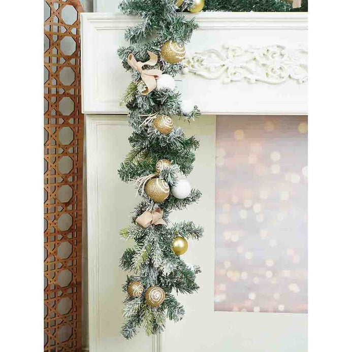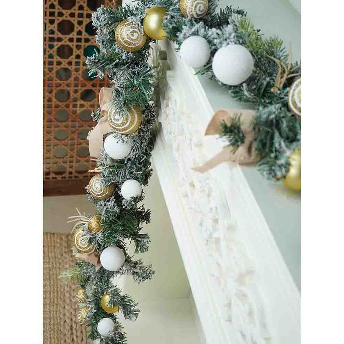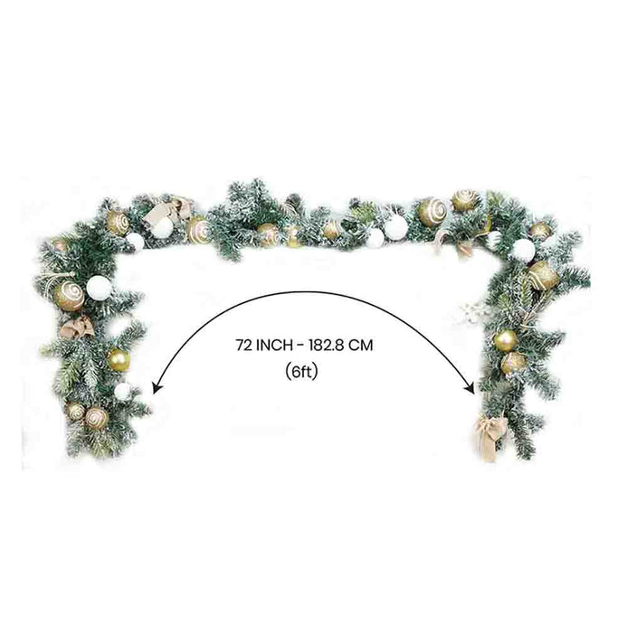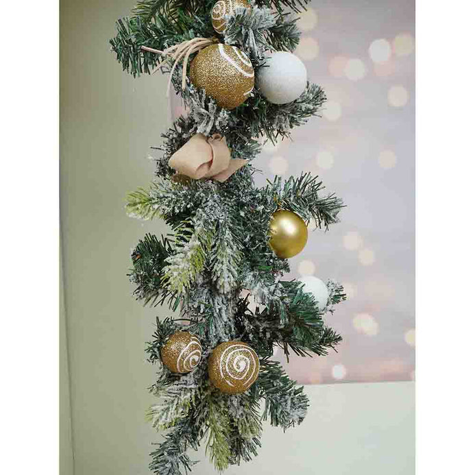 1) Classic Bushy Frosty Gold & White Theme: This beautiful Bushy and Dense filled up Christmas garland is a wholesome stunner.The beautiful combination of Classy and Shiny Gold theme makes it unique from the rest of the garlands available.Gold Swirl Ball ornaments, big Jute Bows, realistic looking cotton stem flowers, gift Boxes, and red shiny golden tree ornaments with thick lush greens makes it stand out and accentuates the area where it is placed.Red & White being the classic combination for christmas makes this piece a total win.