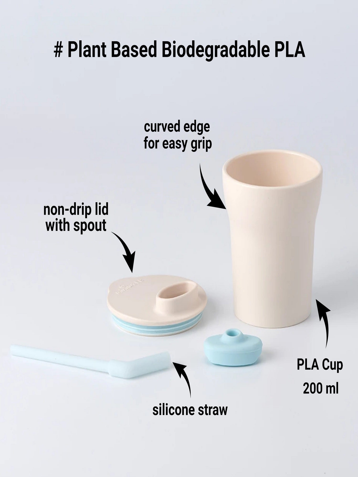 • Designed for Development & Self-feeding: This cup transitions with the kids needs from a soft straw cup to spout cup then to master drinking from a real cup. Includes Cassava PLA Drinking Cup with matching lid and silicon straw. With a capacity of 200 ml, these cups are available in soothing colours.