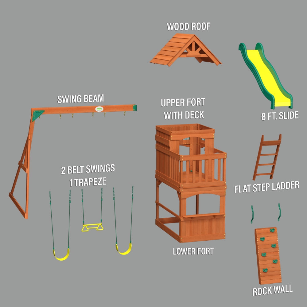 The Atlantis wooden swing set is chock full of features but still fits in smaller yards. It has an awesome upper clubhouse with bay windows and balcony. Down below there's room for a sand box and a snack / activity shelf lets kids play and sip some refreshments at the same time. A flat step entry ladder and solid rock wall allow climbing to be easy or challenging. The 8' speedy slide is safe and fast. There are two belt swings and a trapeze so three can swing at once. This kids' swing set will be fun for years to come!