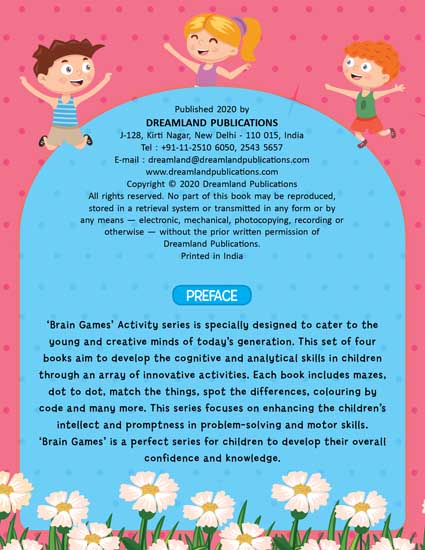 ‘Brain Games’ – an activity book specially designed to cater to the young and creative minds of today’s generation includes activities such as mazes, dot-to-dot, match the things, spot the differences, colouring by code, and many more. This is a perfect book for children to enhance their intellect and promptness in problem-solving. • Ideal for ages 4-5 • 88 pages • An array of innovative activities • Cute colourful presentation • Answers included This book helps the young minds not only to be just occupied but to get their motor skills and creative expressions growing. It is a perfect book for children to develop their overall confidence and knowledge. ?