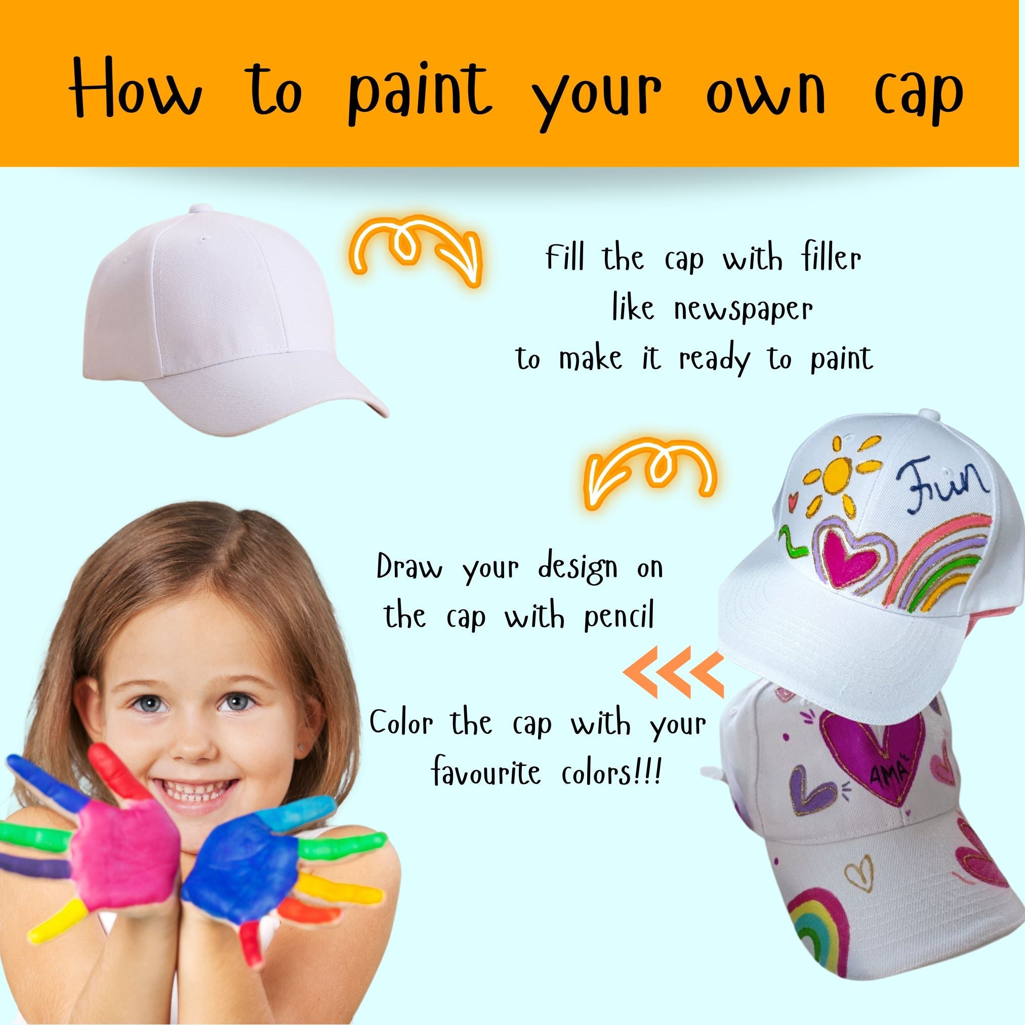 Express yourself and create a wearable piece of art with the Creative Cap Painting Kit. Order yours today and start designing!