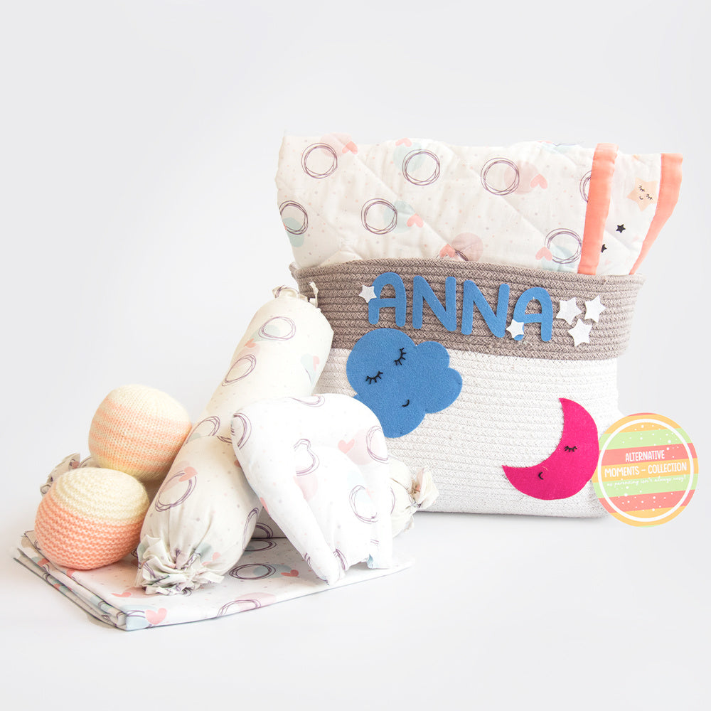 This luxury organic cotton bedding gift basket includes- Adorable cotton storage basket- 1, Oh-So-Cozy Comfort Quilt- 1, Cot Bedsheet- 1, Pillow- 1, Bolsters- 2, Alternative Moments Collection- Set of 10 cards, 1 Sensory soft toy.