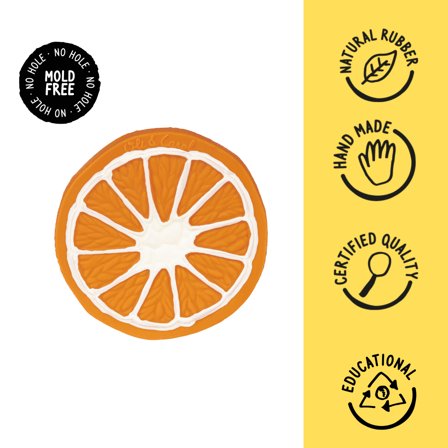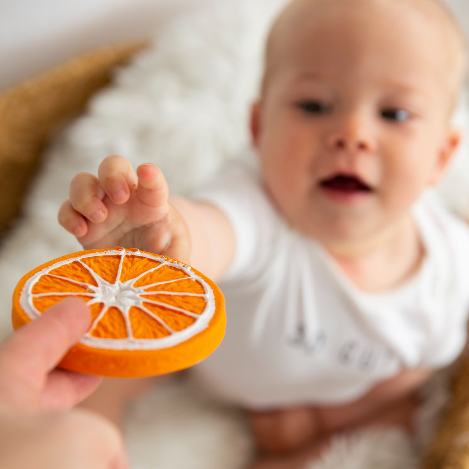 Clementino the Orange is a fruit-shaped baby teether that will stimulate babies? senses while soothing little gums. Introduce kids into a healthy lifestyle from a young age! Did you know that eating oranges is highly nutritional and beneficial for health? It will become babies and kids? favorite teether, bath toy and sensory play toy. This product is perfect as a baby teether, babies and kids toy, bath toy, for sensory play and decorative object. It is made following an artisanal, sustainable and eco-friendly process with 100% natural rubber from Hevea trees. As it is made all in one piece with no holes, it avoids the creation of bacteria inside. Hand painted with natural pigments one by one, so there are no two alike!