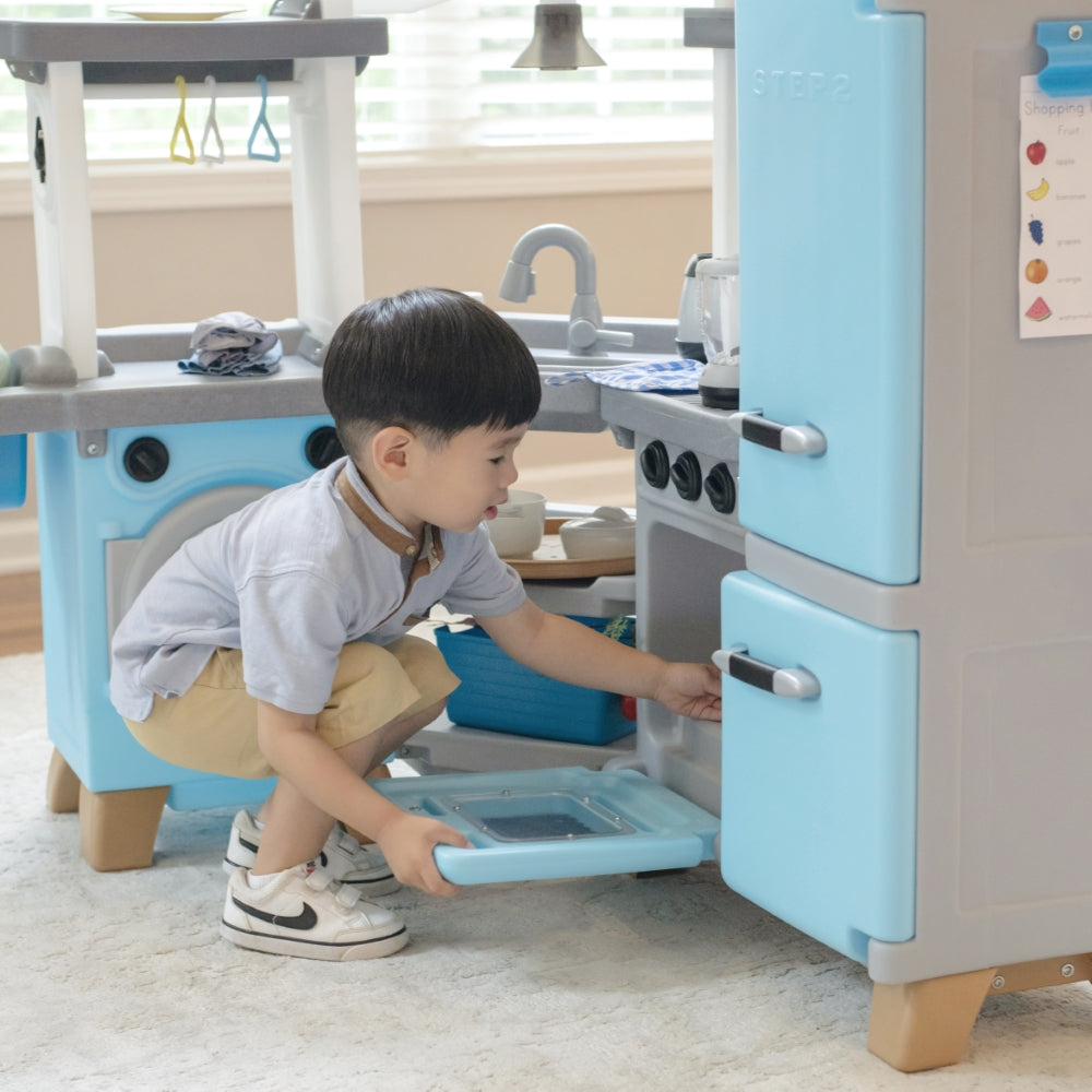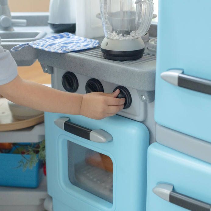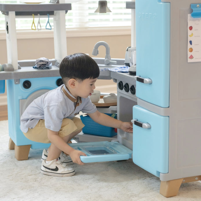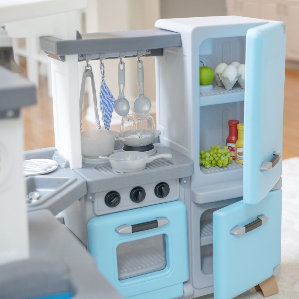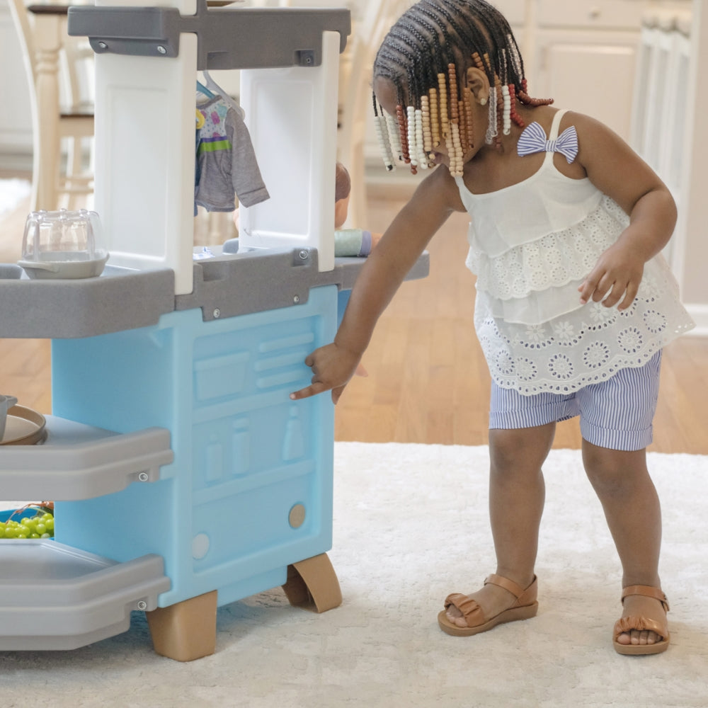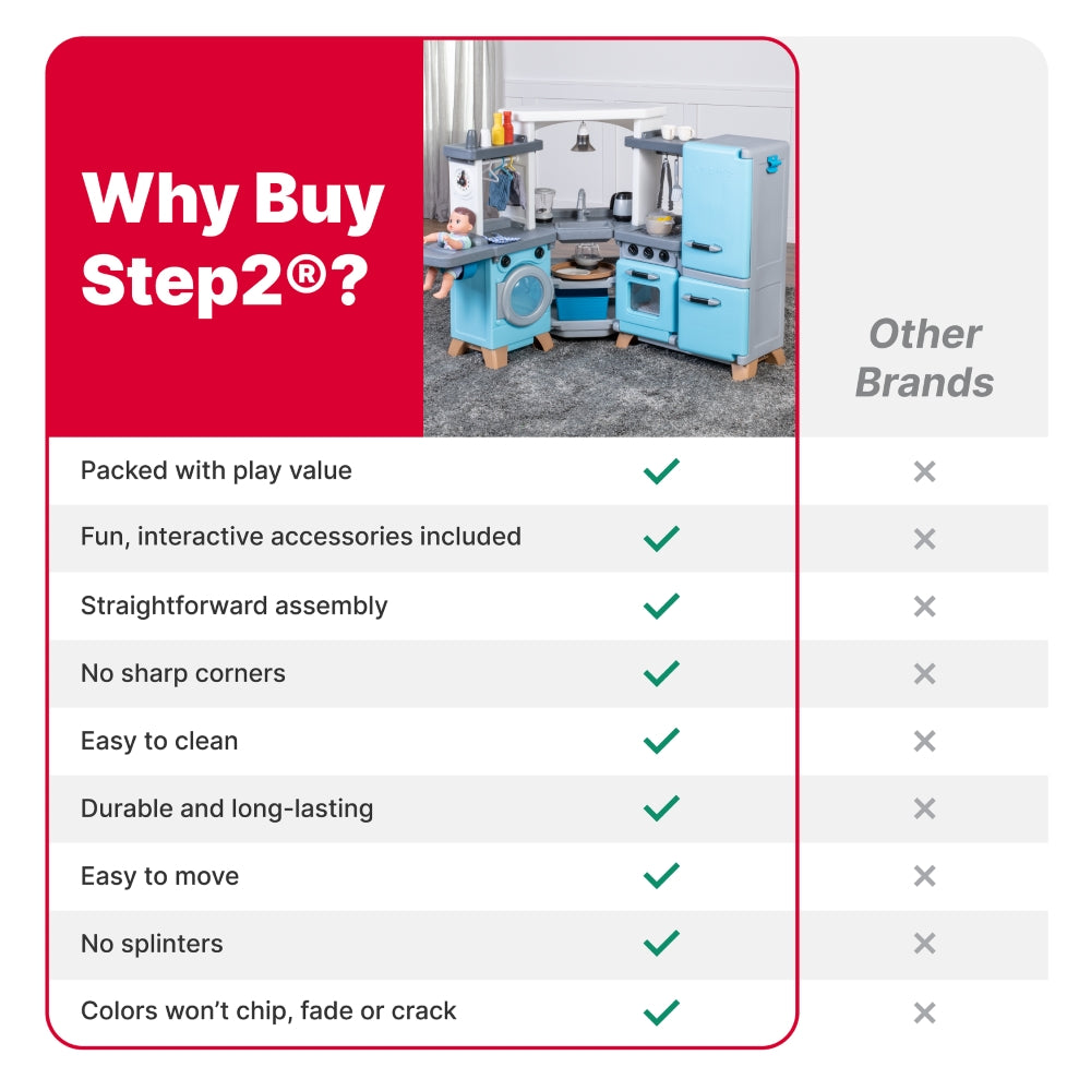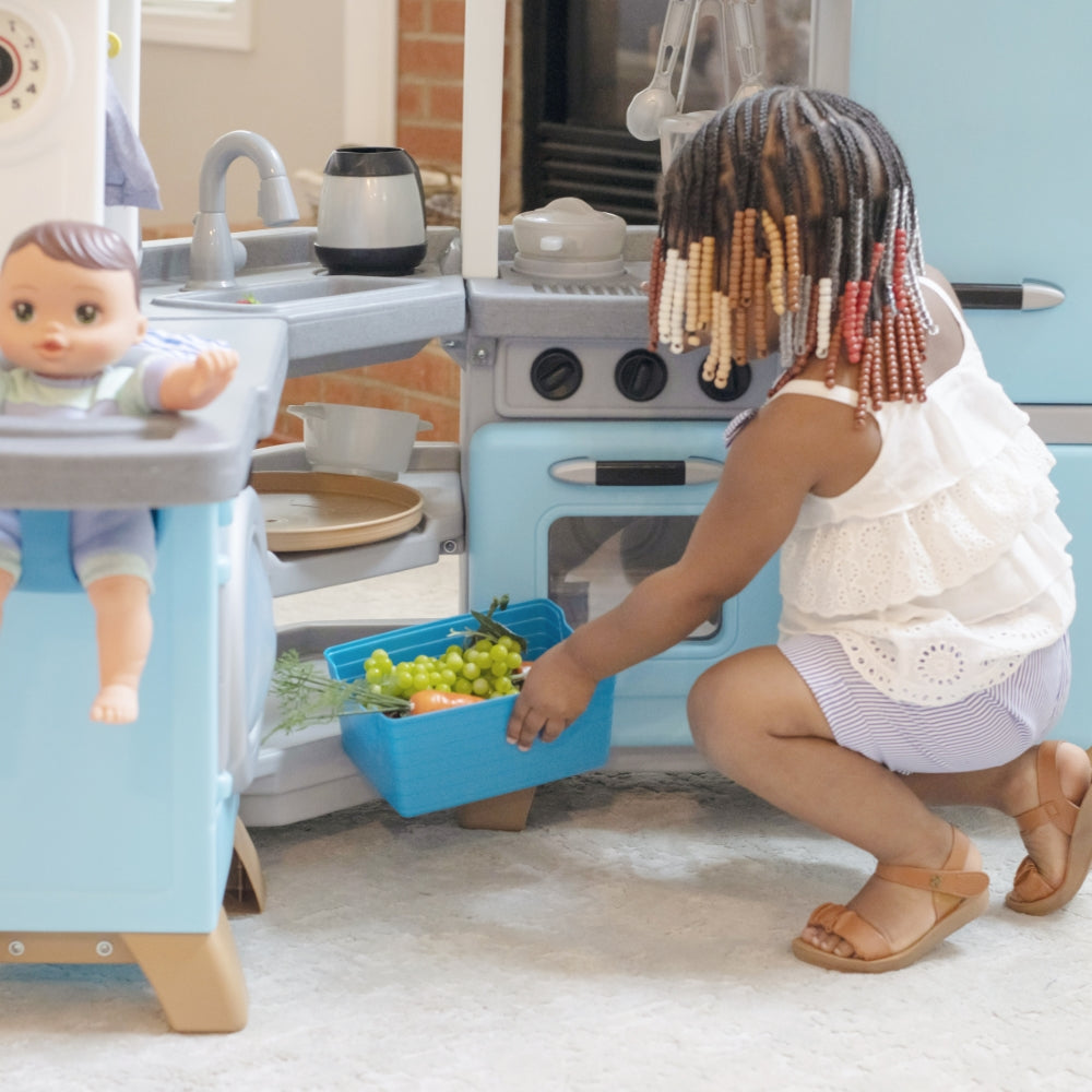 Step into a pretend world full of fun and beautiful design elements with the Cook & Care Corner Kitchen & Nursery™ play kitchen. With plenty of interactive features kids will stay engaged and entertained for hours as they mimic their adult role models by cooking cleaning and caring for their baby doll. Little ones can keep pretend kitchen ingredients fresh in the vintage-style fridge or freezer and store gadgets in extra-large bins. Your child can pretend to fire up the stove illuminate the sink with the push-to-activate hanging light and fry boil blend or pop on the pretend burner with electronic lights and sounds that activate automatically when an item is placed on the surface. Little helpers can load the toy washing machine and hang up clothes to dry while baby doll (not included) relaxes in the built-in highchair. Made in the USA