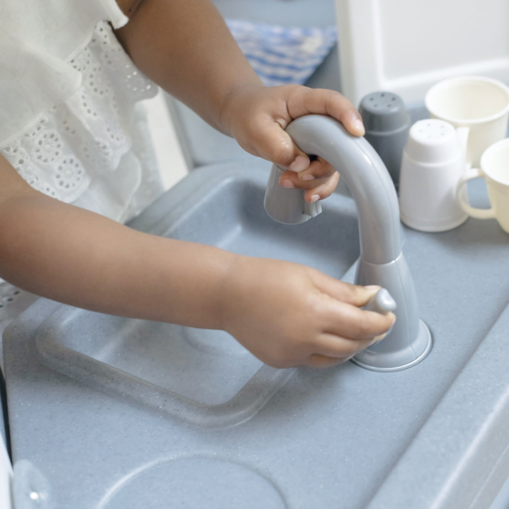 - Realistic Play Kitchen: Features faux stainless steel, lifelike wooden accents & neutral color palette