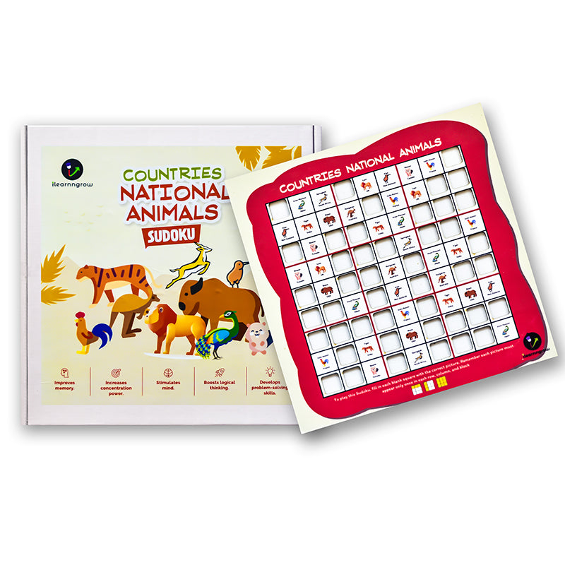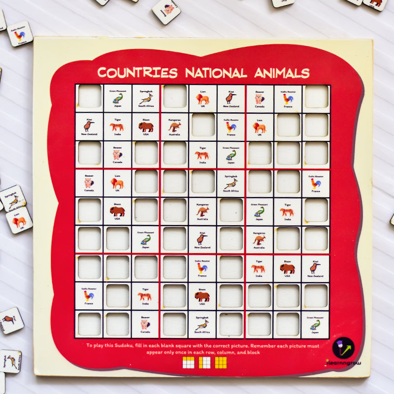 How to Play: Sudoku is played on a grid of 9 x 9 spaces. Within the rows and columns are 9 “squares”. Each row, column and square (9 spaces each) needs to be filled out with the countries national animal, without repeating any national animal within the row, column or square.