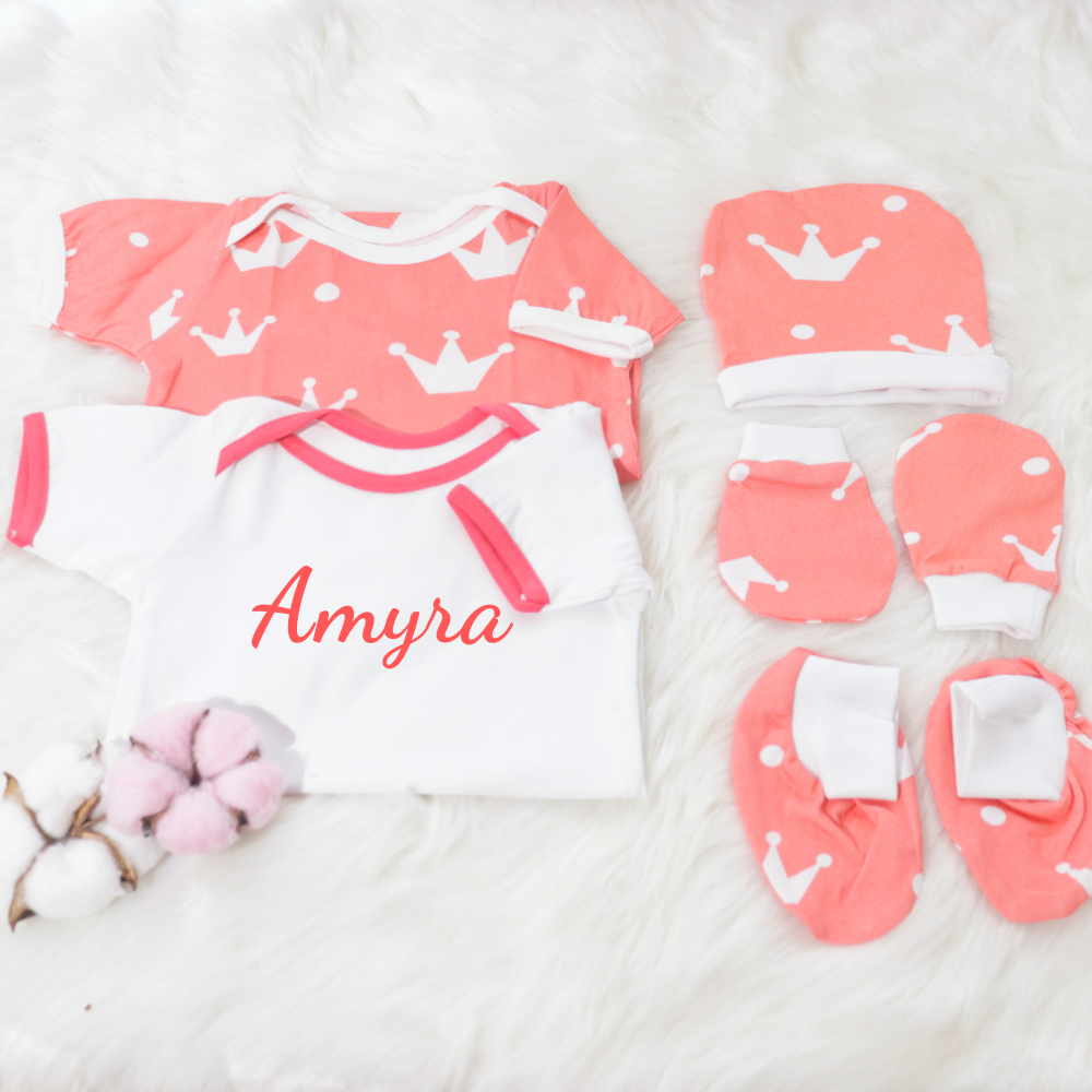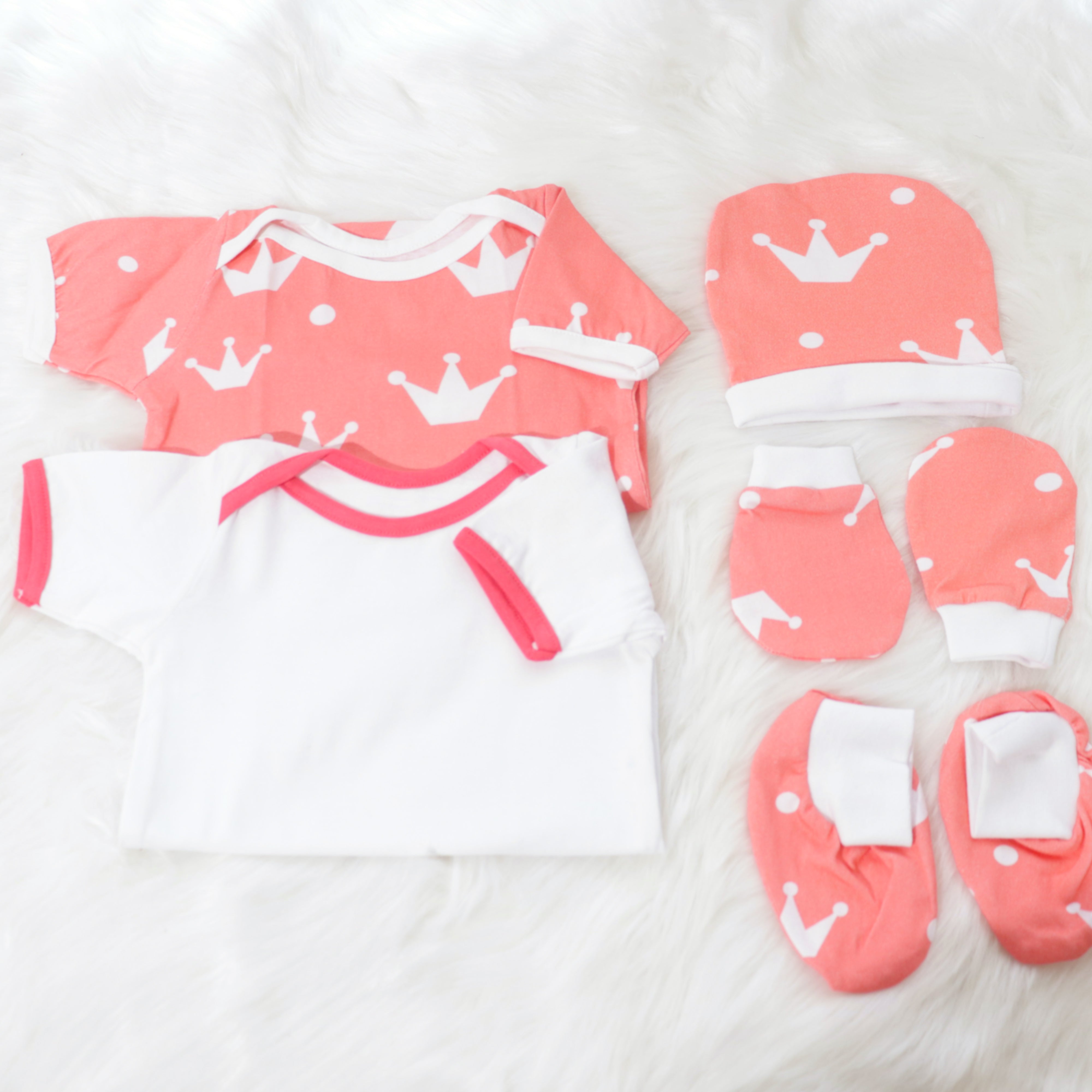 • Set of 7 - 1 cotton cap, 1 pair of mittens, 1 pair of booties, 2 bodysuits.