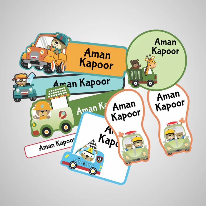 We've made Cute Teddy Bear in charge of carrying your kid's name on his belongings. On some stickons, you'll see him having fun with giraffe while on others he is seen driving cars and a ice cream van. The thought behind the stickon is inspired by the imagination of kids.