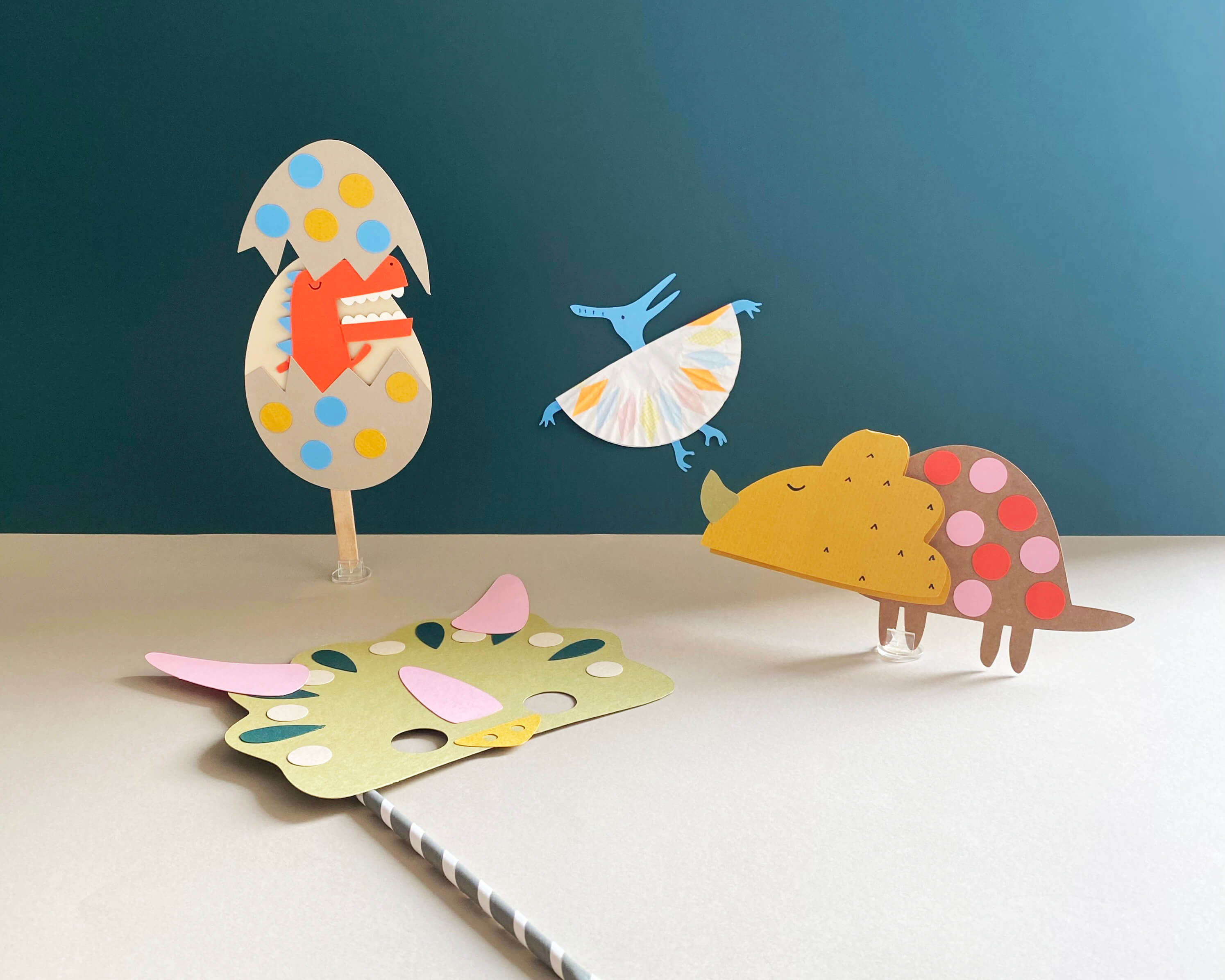"- Four unique dinosaur themed crafts - Step-by-step pictorial instructions All supplies included in box- 1 pterodactyl fridge magnet, 1 mask, 1 triceratops card, 1 hatching dino