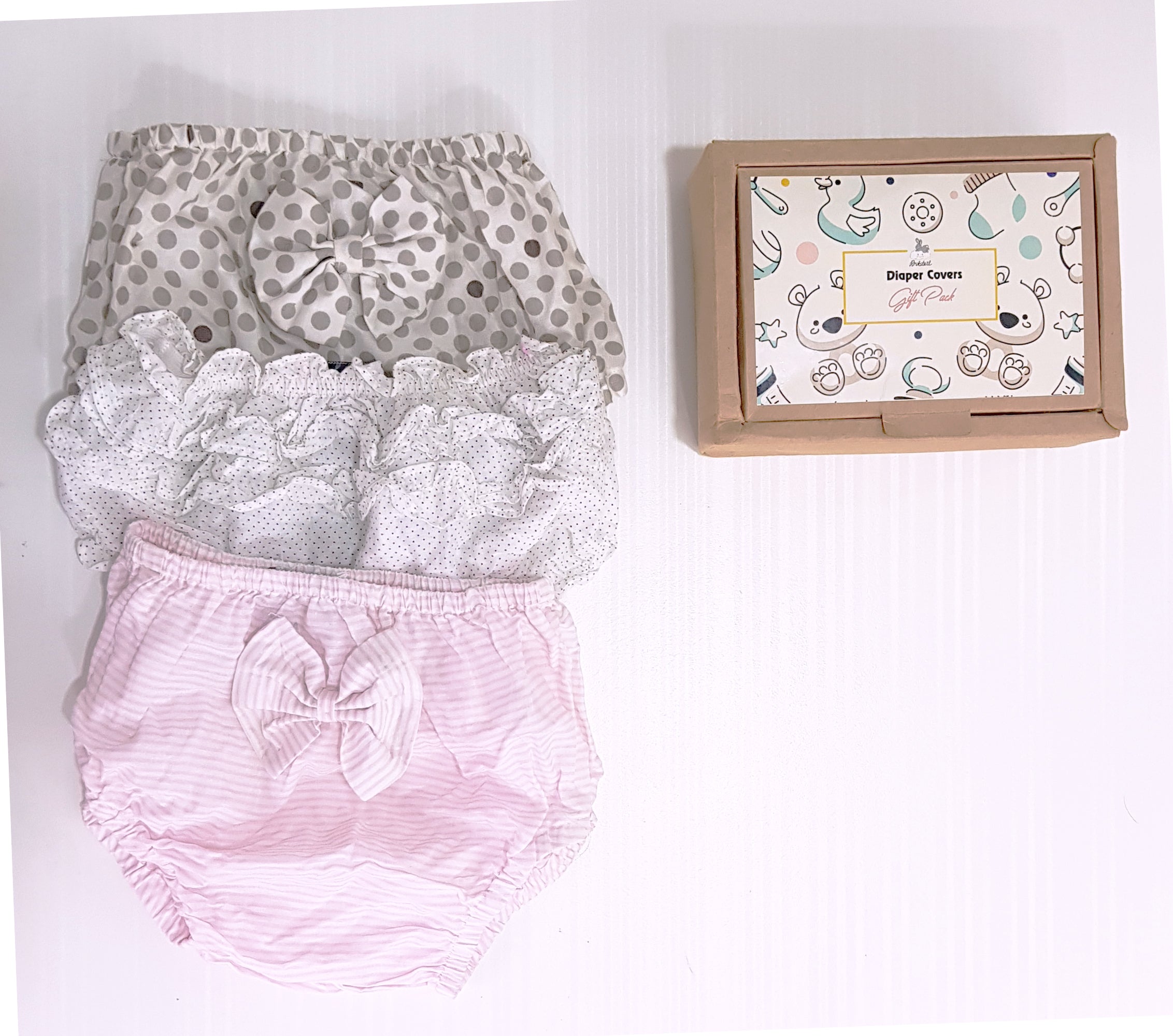 Our diaper covers set comes in pretty neutral colours that would go with an array of dresses. With frills and pretty bows, use these as diaper covers or underwear. The 100% cotton fabric is breathable and soft on the skin. We have a size that would fit a child from one year to four years. Machine washable and super soft elastic makes for a confortable fit.