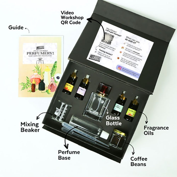 Explore the art of fragrance creation with our DIY Perfume Kit, designed to help you craft your own unique scents from the comfort of your home. This kit includes a comprehensive video guide and a quick reference chart to simplify the perfume-making process.