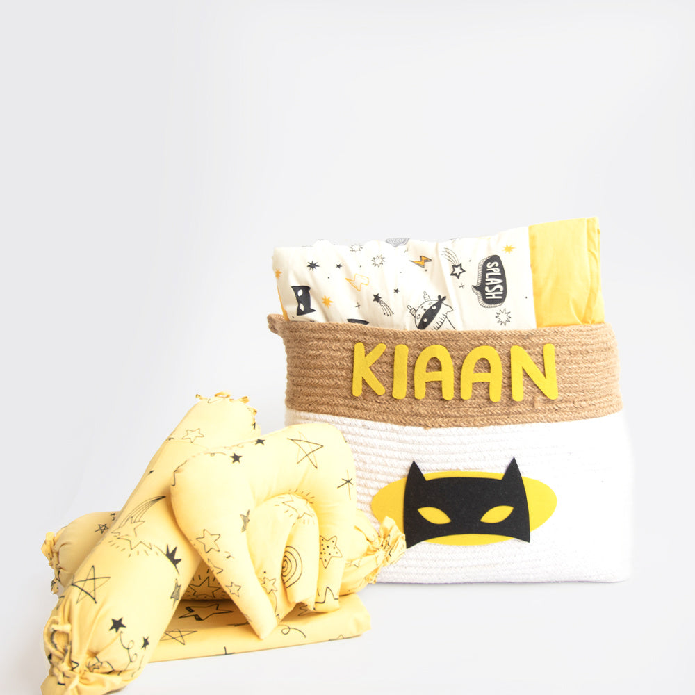 Create a nursery of your dreams with the Yellow Doodle Bedding Collection. This six piece bedding gift hamper includes everything you'll need to have a captivating nursery for your little one! A true assortment of premium cotton-rich baby must-haves, our selection of beautifully curated baskets make the perfect gifts. This luxury organic cotton bedding gift basket includes- Adorable cotton storage basket- 1, Oh-So-Cozy Comfort Quilt- 1, Cot Bedsheet- 1, Pillow- 1, Bolsters- 2.