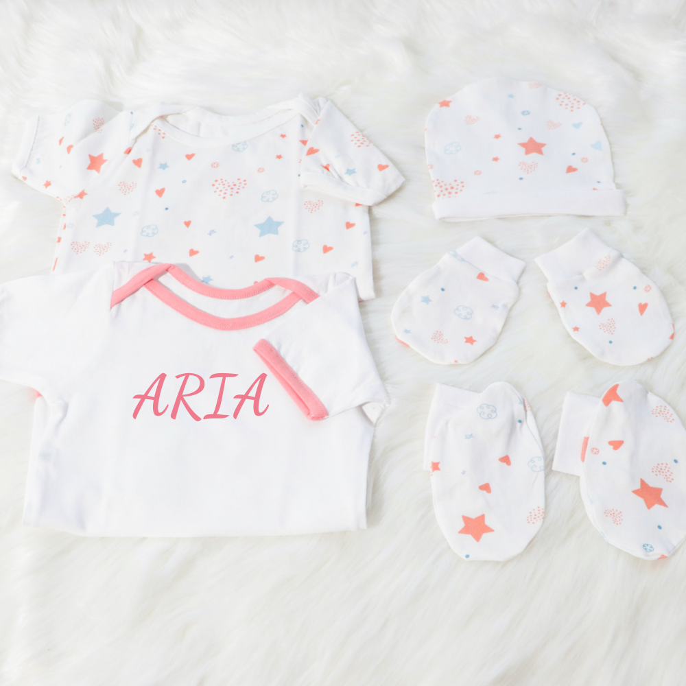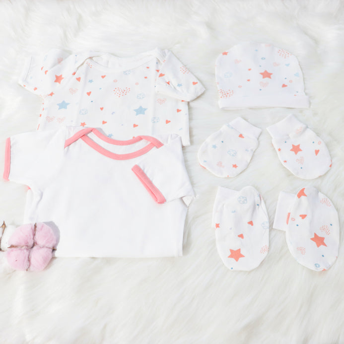 • Set of 7 - 1 cotton cap, 1 pair of mittens, 1 pair of booties, 2 bodysuits.