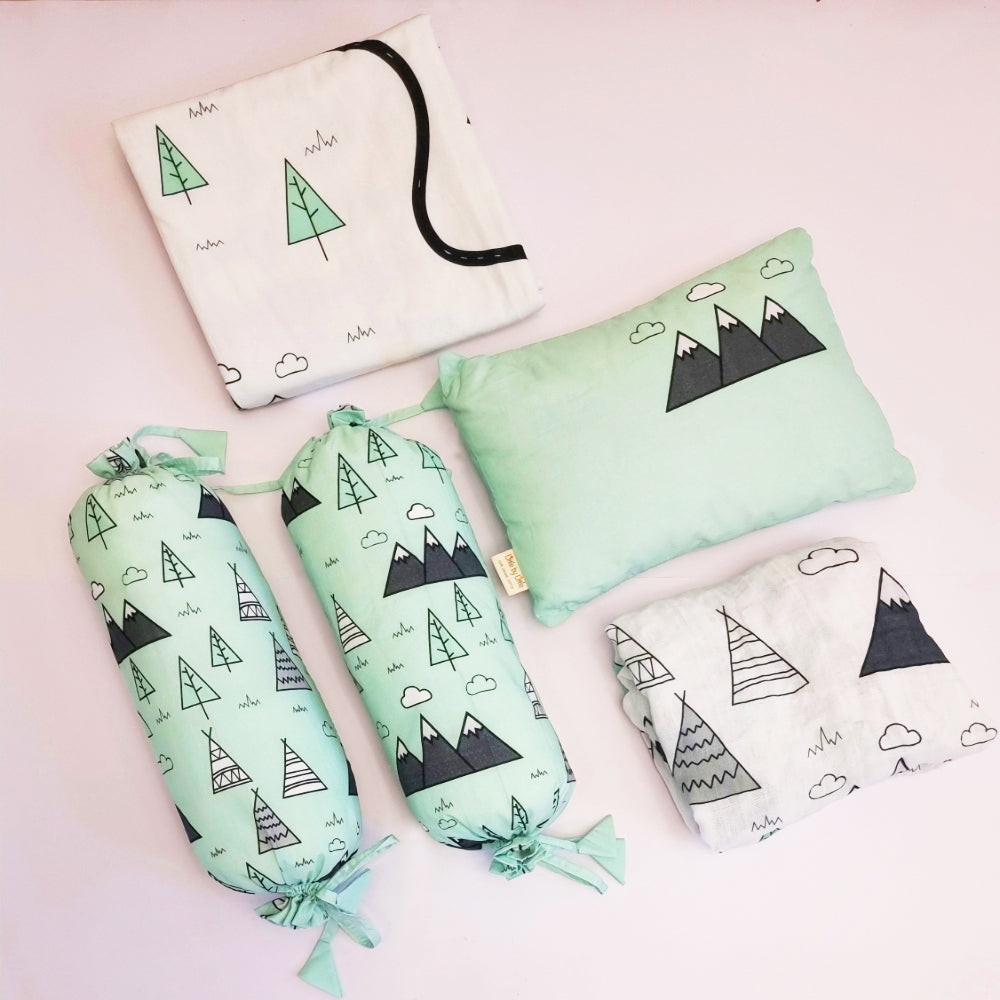 You only want the best for your baby, which includes the bedding they sleep on for many hours a day. Children’s bedding should be bright and sweet just like the little ones who use it. Without sacrificing style or quality, we've curated a batch of bedding that will offer comfort through all the excitement of childhood. If you're looking for children's bedding for a new arrival, our crib bedding sets are perfect to get started with. Our children's bedding have perfectly matched sets comprising of  100% muslin organic cotton fitted sheets ( Fits mattresses 27.5(W) x 55"(L) (70 x 140cm) upto 6" deep), 1 100% organic rai pillow with filler ( 8" Width by 12" Length), 2 100% organic cotton bolsters with fillers ( 14" circumference by 18" Length) and a 100% organic dohar blanket (40" Width by 40" Length) to create a playful look in your child's room. Don't forget to finish the look with our adorable throw pillows which are so cuddlesome. This lightweight and breathable set is just what you need for the modern nursery. Some would say it's love at first cuddle. Give the gift of sweeter dreams to your bundle of joy ! One super-soft crib sheet, one rai pillow, two bolsters and one baby blanket make for a beautifully loving gift.