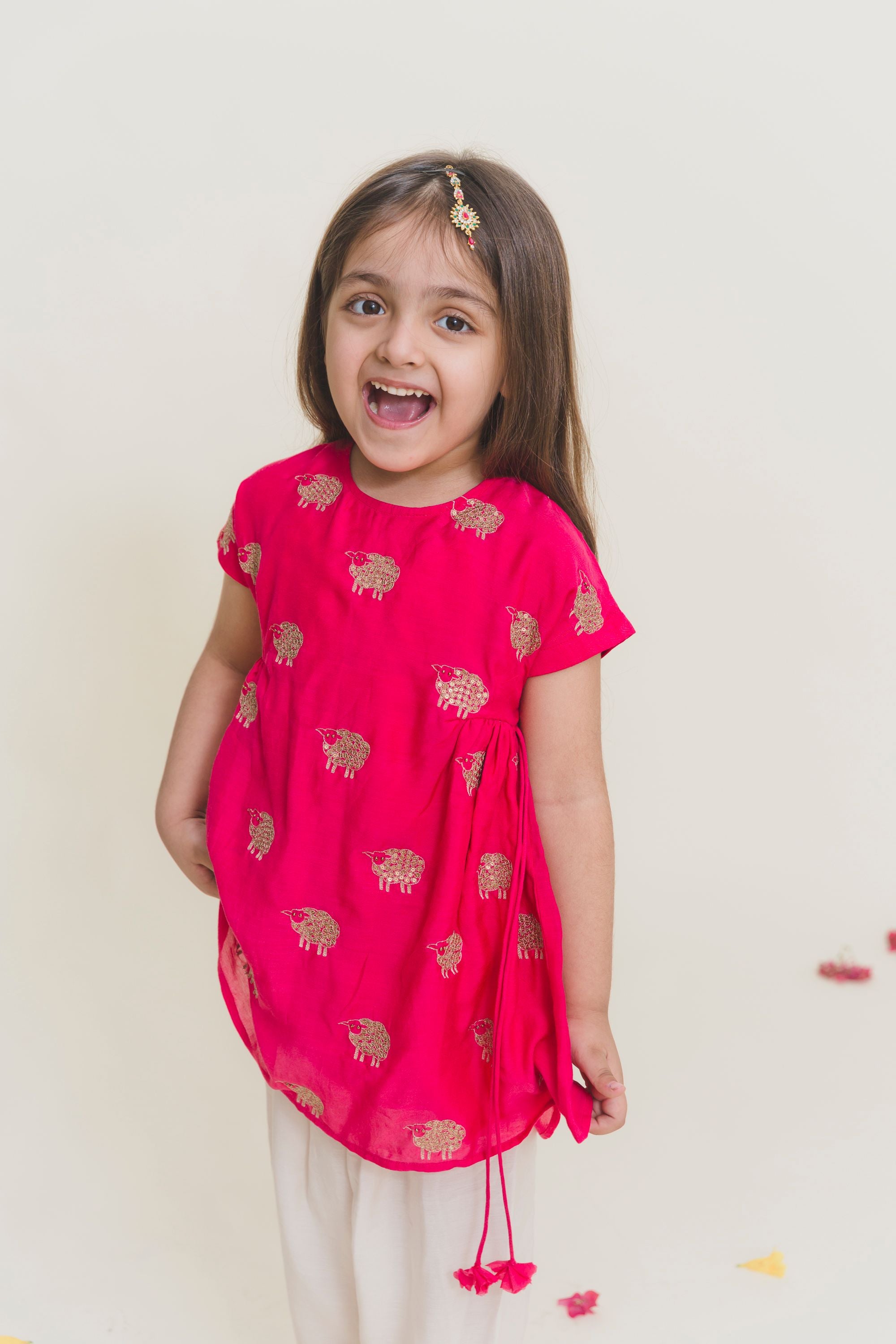 Hand Embroidered Fuschia Pink Sheep Kurta With Muslin Dhoti