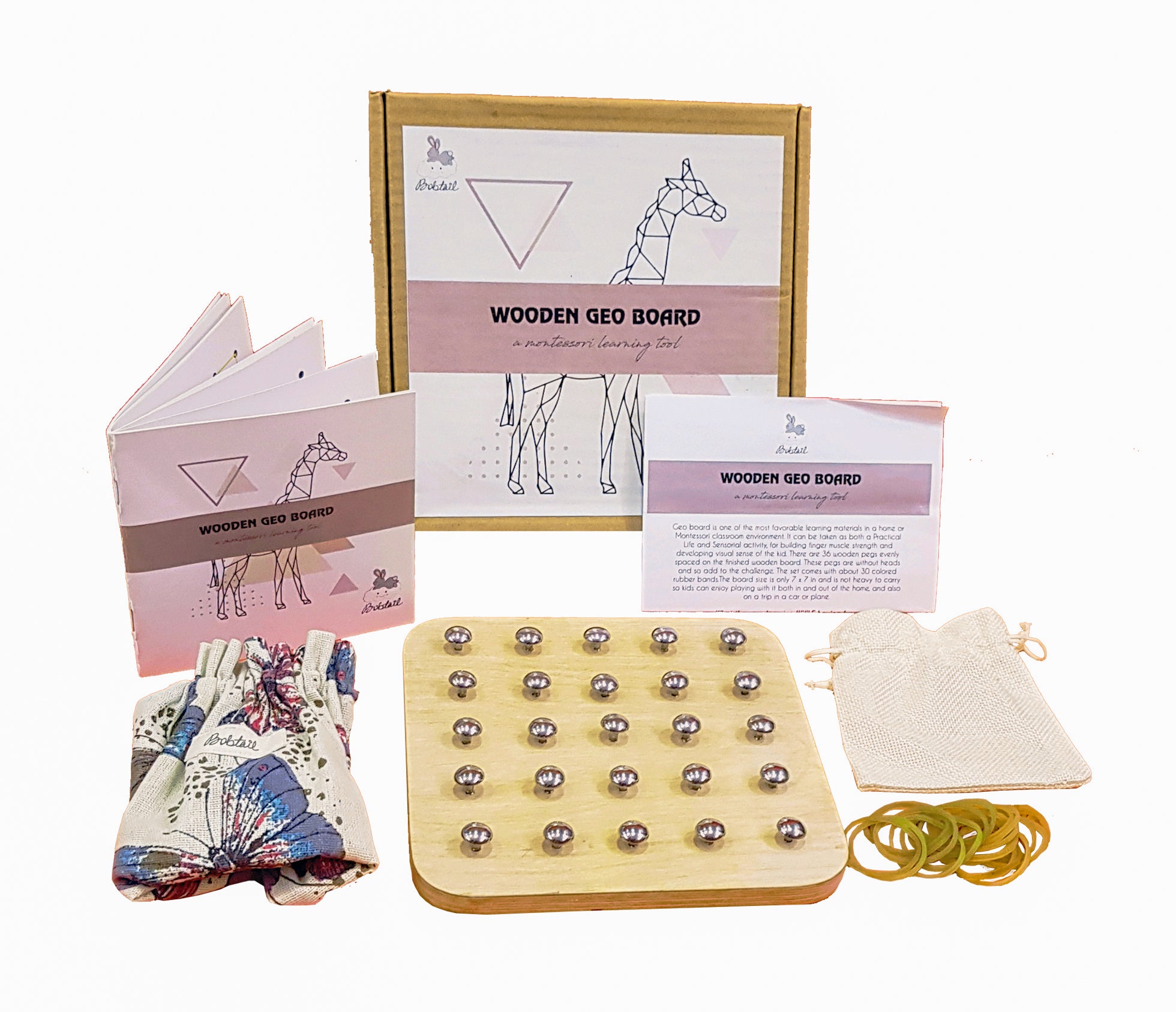 Geo board is one of the most favorable learning materials in a home or Montessori classroom environment. It can be taken as both a Practical Life and Sensorial activity, for building finger muscle strength and developing visual sense of the kid. There are 36 wooden pegs evenly spaced on the finished wooden board. These pegs are without heads and so add to the challenge. The set comes with about 30 colored rubber bands.The board size is only 7 x 7 in and is not heavy to carry so kids can enjoy playing with it both in and out of the home, and also on a trip in a car or plane. What they are learning WHILE having fun: