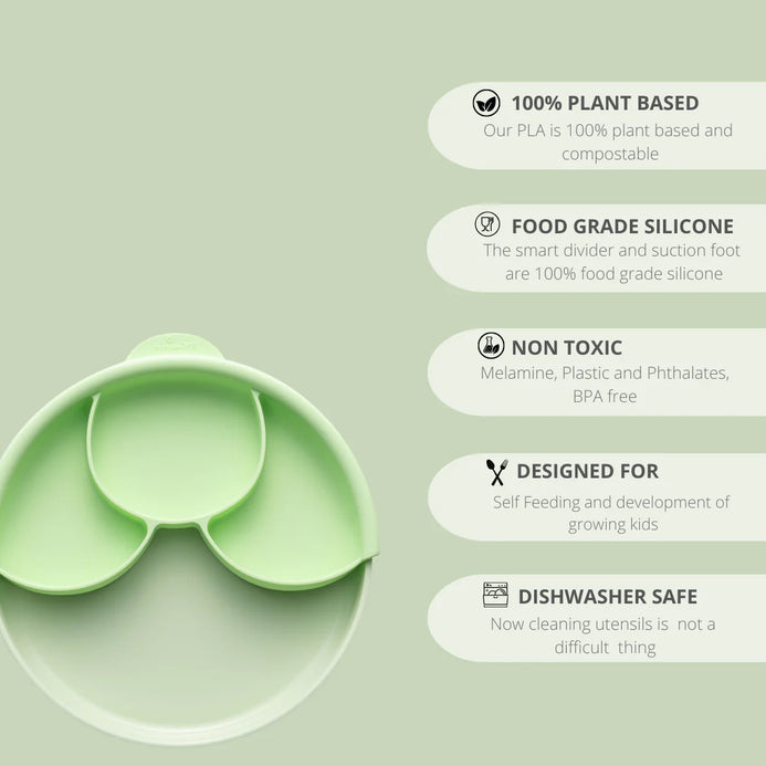 Healthy Meal Set Includes: 1 x Cassava PLA Sandwich Plate, 1 x removable Silicone Divider, 1 x smart detachable Suction Foot with airtight seal, to help keep messy foods in place.