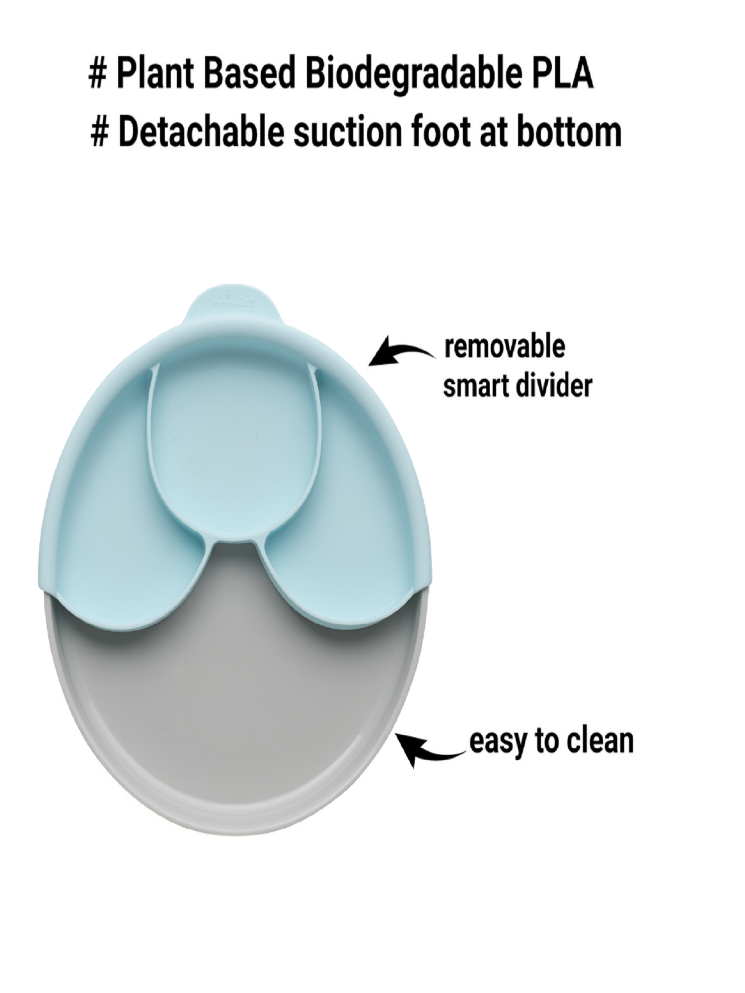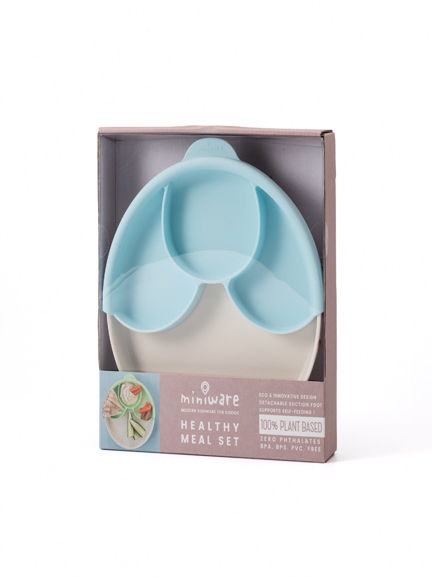 Healthy Meal Set Includes: 1 x Cassava PLA Sandwich Plate, 1 x removable Silicone Divider, 1 x smart detachable Suction Foot with airtight seal, to help keep messy foods in place.