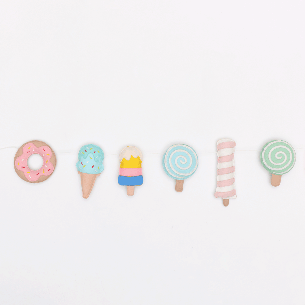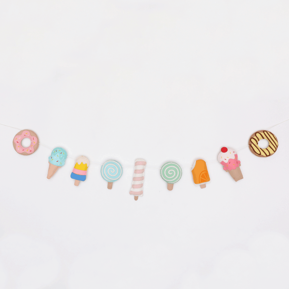 Our cute felt ice cream themed garland immediately sets the tone to your kidàroom dïr. These can be hung across walls or on cribs or the kids shelf or kids room door. Decorated with different colourful popsicles & donuts, this bunting can make perfect addition to the kidàroom theme.
