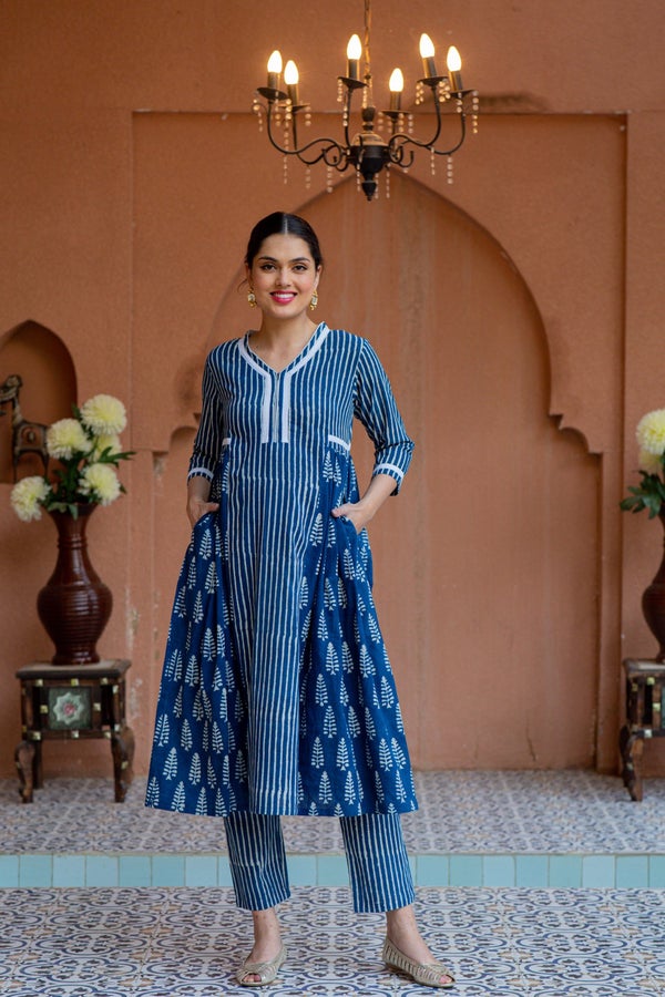 Look gorgeous in our nursing kurta set made in cotton with front buttons to help you feed in comfort. It features plenty of gathers to provide space for easy movement. Wear it while expecting to give space to the growing baby belly and use it to feed later when the little one arrives.