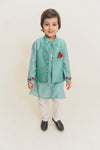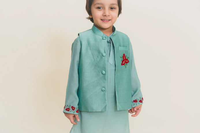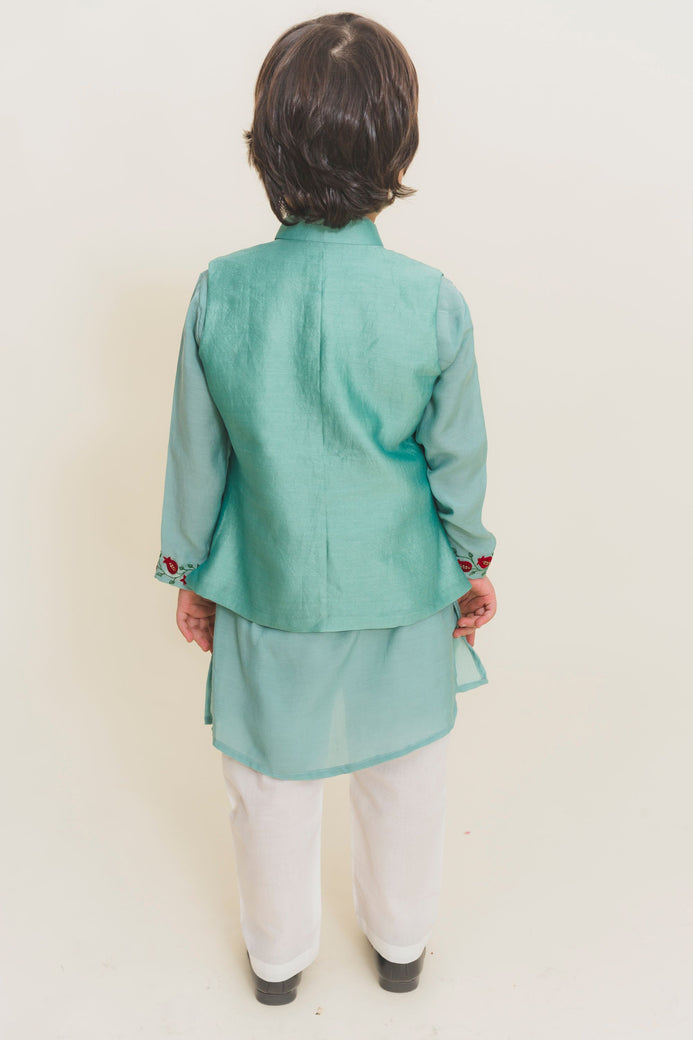 Aqua Blue Anaar Embroidered Chanderi Jacket With Muslin Kurta And Cotton Pyjama.
