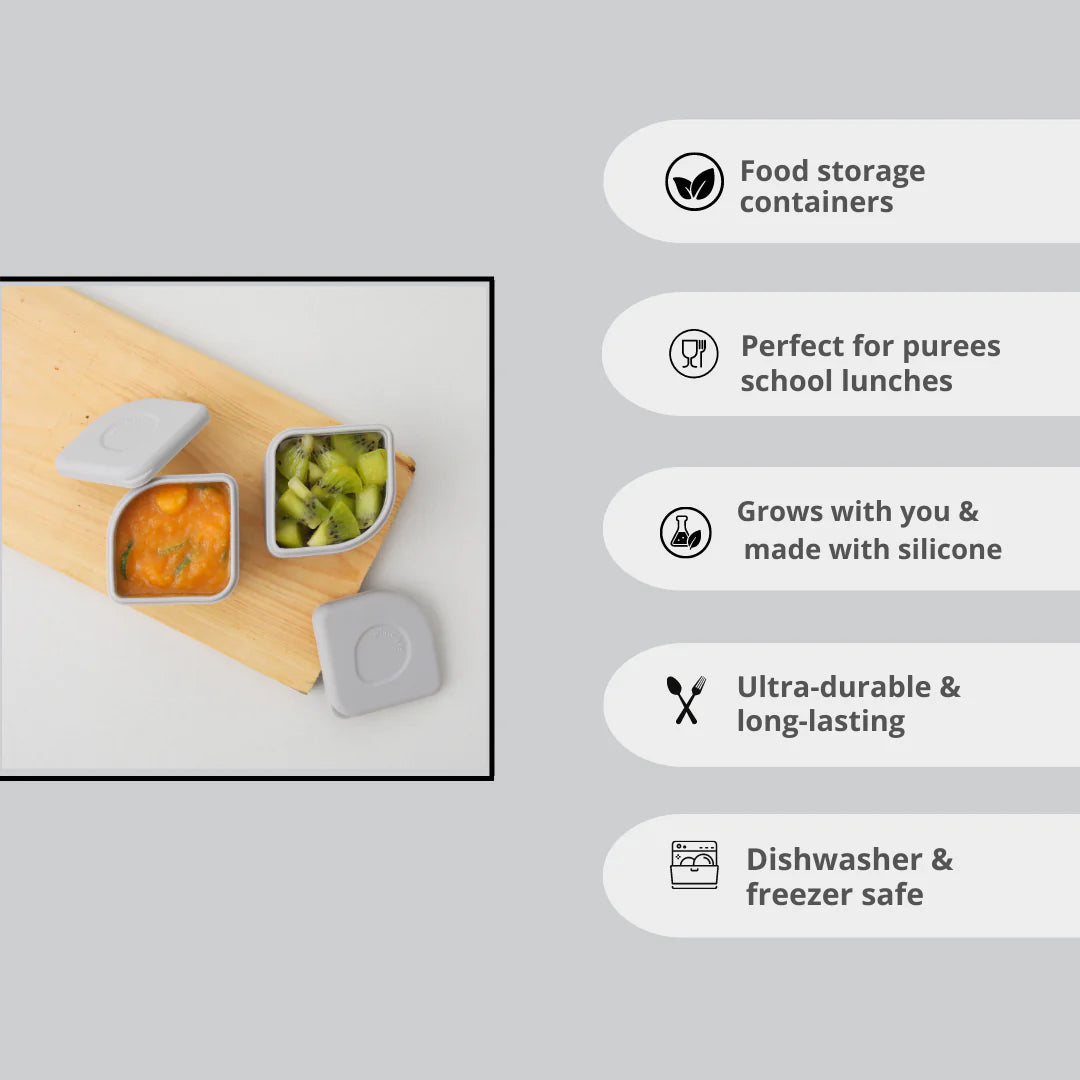 • Miniware Silipods Food Storage Containers Set: Includes 2, capacity 4 oz leak-proof, food-grade silicone Silipods storage containers in Grey.